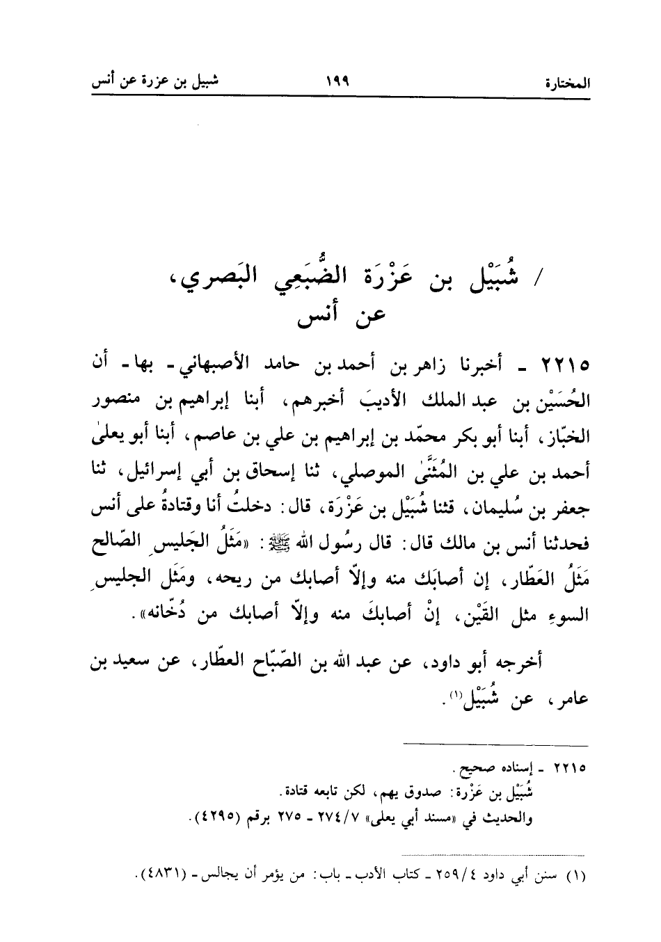 2215 - أَخْبَرَنَا زَاهِرُ بْنُ أَحْمَدَ بْنِ حَامِدٍ الأَصْبَهَانِيُّ بِهَا أَنَّ الْحُسَيْنَ بْنَ عَبْدِ الْمَلِكِ الأَدِيبَ أَخْبَرَهُمْ أبنا إِبْرَاهِيمُ بْنُ مَنْصُورٍ الْخَبَّازُ أبنا أَبُو بَكْرٍ مُحَمَّدُ بْنُ إِبْرَاهِيمَ بْنِ عَلِيِّ بْنِ عَاصِمٍ أبنا أَبُو يَعْلَى أَحْمَدُ بْنُ عَلِيِّ بْنِ الْمُثَنَّى الْمَوْصِلِيُّ ثَنَا إِسْحَاقُ بْنُ أَبِي إِسْرَائِيلَ ثَنَا جَعْفَرُ بْنُ سُلَيْمَانَ قثنا شُبَيْلُ بْنُ عَزْرَةَ قَالَ دَخَلْتُ أَنَا وَقَتَادَةُ عَلَى أَنَسٍ فَحَدَّثَنَا أَنَسُ بْنُ مَالِكٍ قَالَ قَالَ رَسُولُ اللَّهِ صَلَّى اللَّهُ عَلَيْهِ وَسَلَّمَ مَثَلُ الْجَلِيسِ الصَّالِحِ مَثَلُ الْعَطَّارِ إِنْ أَصَابَكَ مِنْهُ وَإِلا أَصَابَكَ مِنْ رِيحِهِ وَمَثَلُ الْجَلِيسِ السُّوءِ مَثَلُ الْقَيْنِ إِنْ أَصَابَكَ مِنْهُ وَإِلا أَصَابَكَ مِنْ دُخَانِهِ