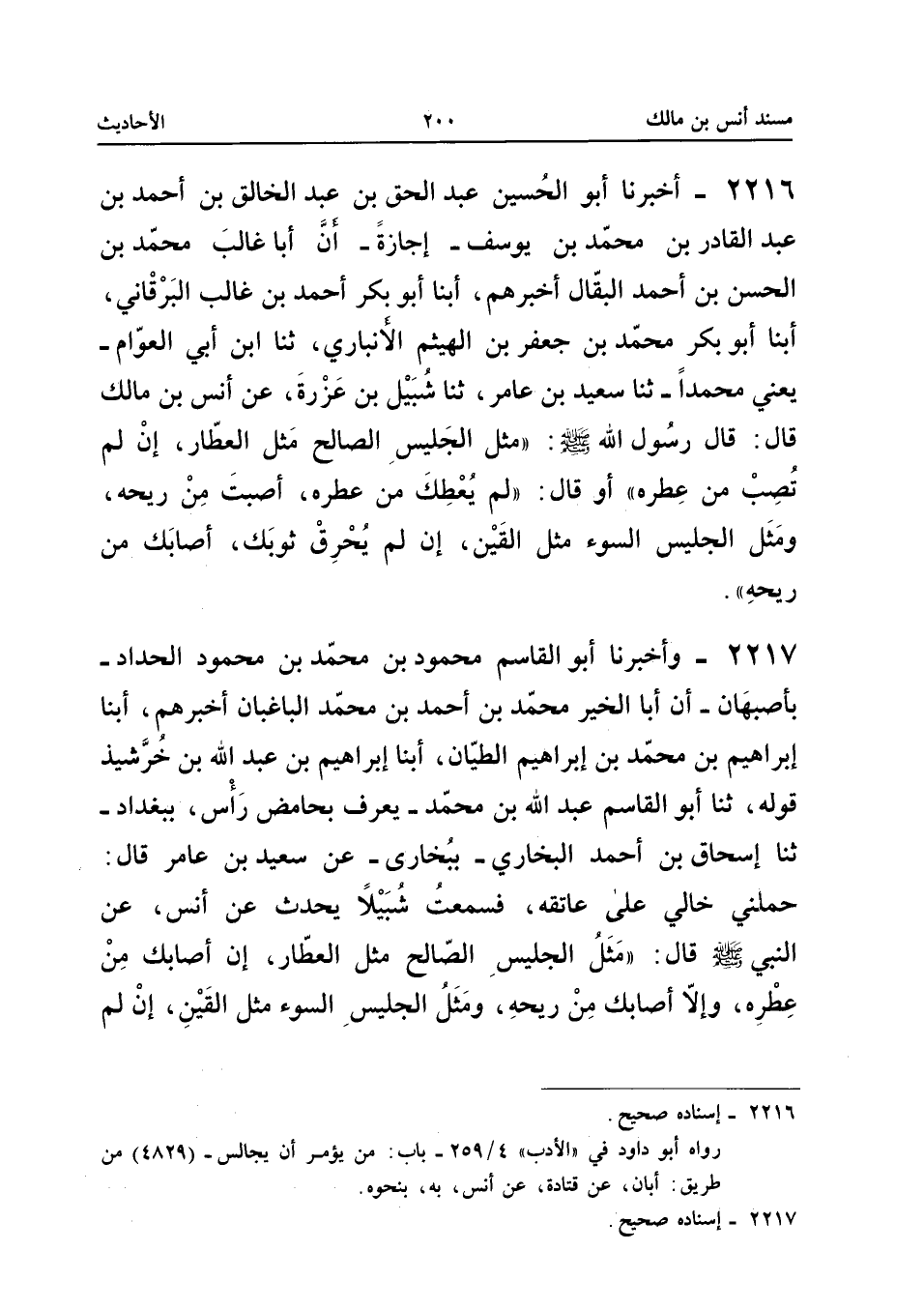 2216 - أَخْبَرَنَا أَبُو الْحُسَيْنِ عَبْدُ الْحَقِّ بْنُ عَبْدِ الْخَالِقِ بْنِ أَحْمَدَ بْنِ عَبْدِ الْقَادِرِ بْنِ مُحَمَّدِ بْنِ يُوسُفَ إِجَازَةً أَنَّ أَبَا غَالِبٍ مُحَمَّدَ بْنَ الْحَسَنَ بْنِ أَحْمَدَ الْبَقَّالُ أَخْبَرَهُمْ أبنا أَبُو بَكْرٍ أَحْمَدُ بْنُ غَالِبٍ الْبَرْقَانِيُّ أبنا أَبُو بَكْرٍ مُحَمَّدُ بْنُ جَعْفَرِ بْنِ الْهَيْثَمِ الأَنْبَارِيُّ ثَنَا ابْنُ أَبِي الْعَوَّامِ يَعْنِي مُحَمَّدًا ثَنَا سَعِيدُ بْنُ عَامِرٍ ثَنَا شُبَيْلُ بْنُ عَزْرَةَ عَنْ أَنَسِ بْنِ مَالِكٍ قَالَ قَالَ رَسُولُ اللَّهِ صَلَّى اللَّهُ عَلَيْهِ وَسَلَّمَ مَثَلُ الْجَلِيسِ الصَّالِحِ مَثَلُ الْعَطَّارِ إِنْ لَمْ تُصِبْ مِنْ عِطْرِهِ أَوْ قَالَ لَمْ يُعْطِكَ مِنْ عِطْرِهِ أَصَبْتَ مِنْ رِيحِهِ وَمَثَلُ الْجَلِيسِ السُّوءِ مَثَلُ الْقَيْنِ إِنْ لَمْ يُحْرِقْ ثَوْبَكَ أَصَابَك من رِيحه إِسْنَاده صَحِيح