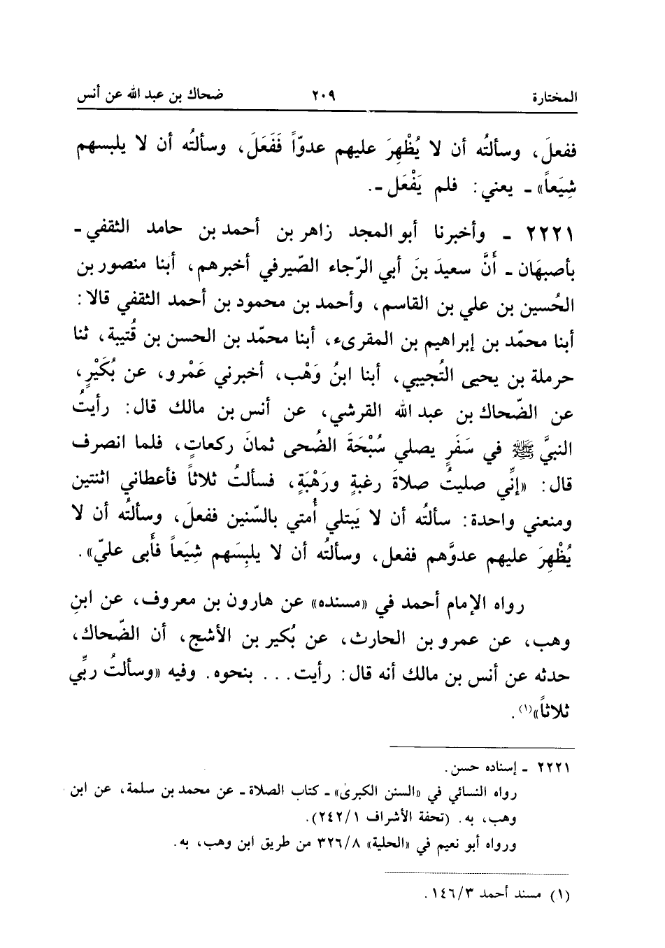 2221 - وَأَخْبَرَنَا أَبُو الْمَجْدِ زَاهِرُ بْنُ أَحْمَدَ بْنِ حَامِدٍ الثَّقَفِيُّ بِأَصْبَهَانَ أَنَّ سَعِيدَ بْنَ أَبِي الرَّجَاءِ الصَّيْرَفِيَّ أَخْبَرَهُمْ أبنا مَنْصُورُ بْنُ الْحُسَيْنِ بْنِ عَلِيِّ بْنِ الْقَاسِمِ وَأَحْمَدُ بْنُ مَحْمُودِ بْنِ أَحْمَدَ الثَّقَفِيُّ قَالا أبنا مُحَمَّدُ بْنُ إِبْرَاهِيم بن الْمُقْرِئِ أبنا مُحَمَّدُ بْنُ الْحَسَنِ بْنِ قُتَيْبَةَ ثَنَا حَرْمَلَةُ بْنُ يَحْيَى التُّجِيبِيُّ أبنا ابْنُ وَهْبٍ أَخْبَرَنِي عَمْرٌو عَنْ بُكَيْرٍ عَنِ الضَّحَّاكِ بْنُ عَبْدِ اللَّهِ الْقُرَشِيُّ عَنْ أَنَسِ بْنِ مَالِكٍ قَالَ رَأَيْتُ النَّبِيَّ صَلَّى اللَّهُ عَلَيْهِ وَسَلَّمَ فِي سَفَرٍ يُصَلِّي سُبْحَةَ الضُّحَى ثَمَانِ رَكْعَاتٍ فَلَمَّا انْصَرَفَ قَالَ إِنِّي صَلَّيْتُ صَلاةَ رَغْبَةٍ وَرَهْبَةٍ فَسَأَلْتُ ثَلاثًا فَأْعَطَانِي اثْنَتَيْنِ وَمَنَعَنِي وَاحِدَةً سَأَلْتُهُ أَنْ لَا يَبْتَلِيَ أُمَّتِي بِالسِّنِينَ فَفَعَلَ وَسَأَلْتُهُ أَنْ لَا يُظْهِرَ عَلَيْهِمْ عَدُوَّهُمْ فَفَعَلَ وَسَأَلْتُهُ أَنْ لَا يَلْبِسَهُمْ شِيَعًا فَأَبَى عَلَيَّ
