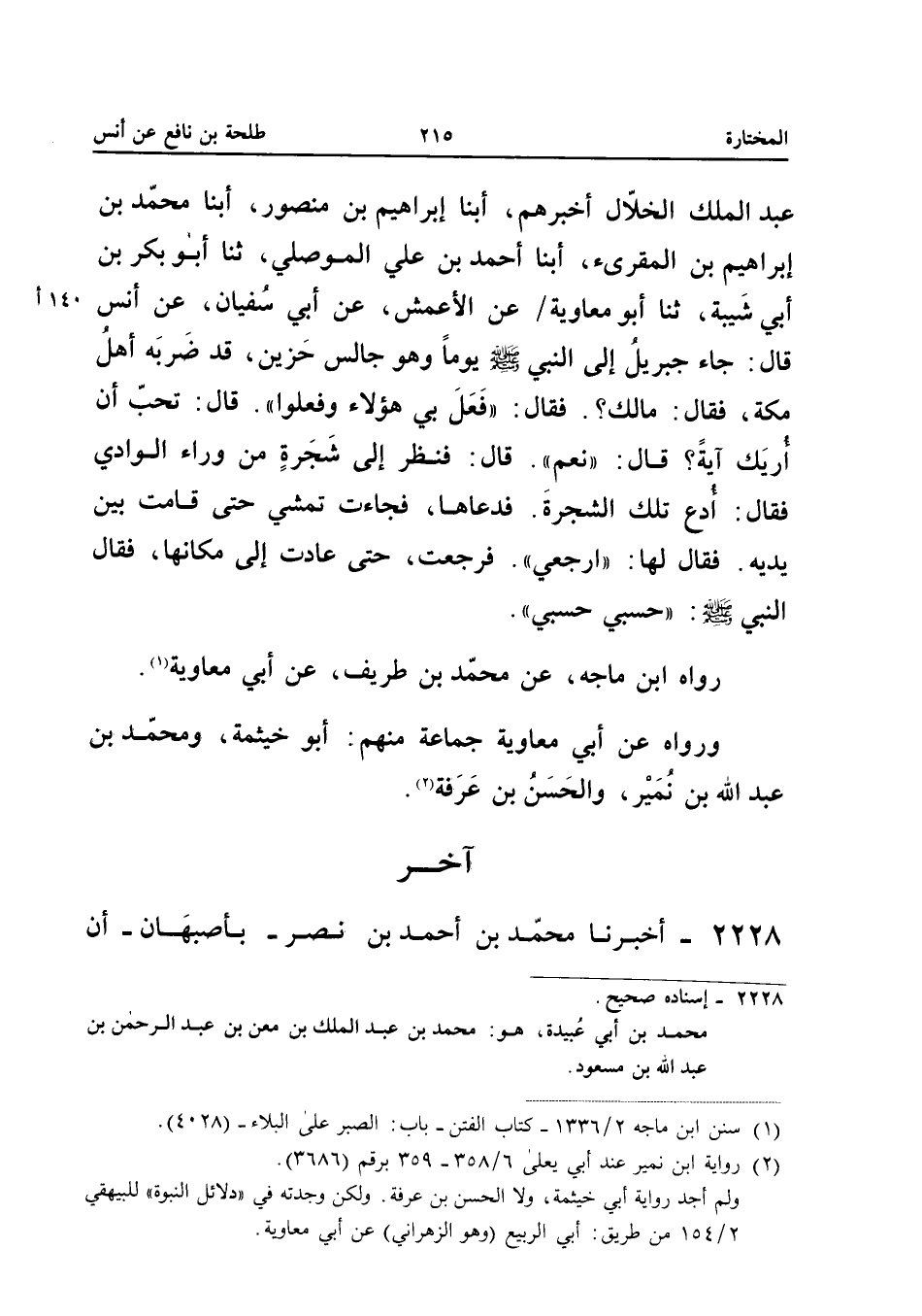صَلَّى اللَّهُ عَلَيْهِ وَسَلَّمَ يَوْمًا وَهُوَ جَالِسٌ حَزِين قد ضربه أهل مَكَّة فَقَالَ مَالك فَقَالَ فَعَلَ بِي هَؤُلاءِ وَفَعَلُوا قَالَ تُحِبُّ أَنْ أُرِيَكَ آيَةً قَالَ نَعَمْ قَالَ فَنَظَرَ إِلَى شَجَرَةٍ مِنْ وَرَاءِ الْوَادِي فَقَالَ ادْعُ تِلْكَ الشَّجَرَةَ فَدَعَاهَا فَجَاءَتْ تَمْشِي حَتَّى قَامَتْ بَيْنَ يَدَيْهِ فَقَالَ لَهَا ارْجِعِي فَرَجَعَتْ حَتَّى عَادَتْ إِلَى مَكَانِهَا فَقَالَ النَّبِيُّ صَلَّى اللَّهُ عَلَيْهِ وَسَلَّمَ حَسْبِي حَسْبِي رَوَاهُ ابْنُ مَاجَهْ عَنْ مُحَمَّدِ بْنِ طَرِيفٍ عَنْ أَبِي مُعَاوِيَةَ وَرَوَاهُ عَنْ أَبِي مُعَاوِيَةَ جَمَاعَةٌ مِنْهُمْ أَبُو خَيْثَمَةَ وَمُحَمَّدُ بْنُ عَبْدِ اللَّهِ بْنِ نُمَيْرٍ وَالْحسن بن عَرَفَة