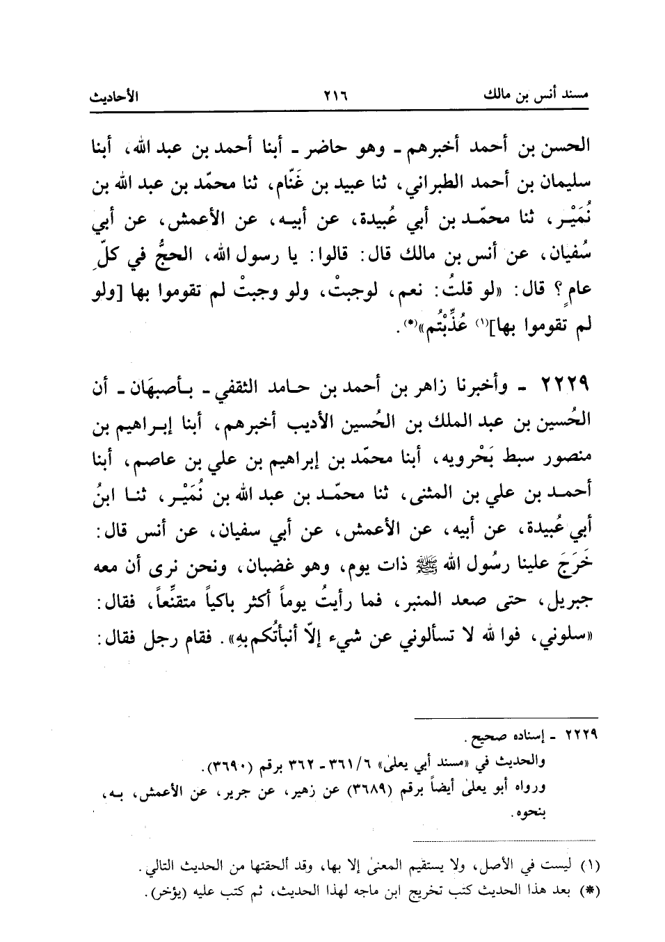 2229 - وَأَخْبَرَنَا زَاهِرُ بْنُ أَحْمَدَ بْنِ حَامِدٍ الثَّقَفِيُّ بِأَصْبَهَانَ أَنَّ الْحُسَيْنَ بن عبد الْملك بن الْحُسَيْن الديب أَخْبَرَهُمْ أبنا إِبْرَاهِيمُ بْنُ مَنْصُورٍ سِبْطُ بَحْرُوَيْهِ أبنا مُحَمَّدُ بْنُ إِبْرَاهِيمَ بْنِ عَلِيِّ بْنِ عَاصِمٍ أبنا أَحْمَدُ بْنُ عَلِيِّ بْنِ الْمُثَنَّى ثَنَا مُحَمَّدُ بْنُ عَبْدِ اللَّهِ بْنِ نُمَيْرٍ ثَنَا ابْنُ أَبِي عُبَيْدَةَ عَنْ أَبِيهِ عَنِ الأَعْمَشِ عَنْ أَبِي سُفْيَانَ عَنْ أَنَسٍ قَالَ خَرَجَ عَلَيْنَا رَسُولُ اللَّهِ صَلَّى اللَّه عَلَيْهِ وَسَلَّمَ ذَاتَ يَوْمٍ وَهُوَ غَضْبَانُ وَنَحْنُ نَرَى أَنَّ مَعَهُ جِبْرِيلَ حَتَّى صَعَدَ الْمِنْبَرَ فَمَا رَأَيْتُ يَوْمًا أَكْثَرَ بَاكِيًا مُتَقَنِّعًا فَقَالَ سَلُونِي فَوَاللَّهِ لَا تَسْأَلُونِي عَنْ شَيْءٍ إِلا أَنْبَأْتُكُمْ بِهِ فَقَامَ رَجُلٌ فَقَالَ