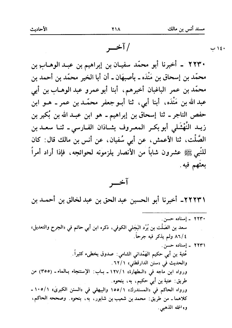 2230 - أَخْبَرَنَا أَبُو مُحَمَّدٍ سُفْيَانُ بْنُ إِبْرَاهِيمَ بْنِ عَبْدُ الْوَهَّابِ بْنُ مُحَمَّدِ بْنِ إِسْحَاقَ بْنِ مَنْدَهْ بِأَصْبَهَانَ أَنَّ أَبَا الْخَيْرِ مُحَمَّدَ بْنَ أَحْمَدَ بْنِ مُحَمَّدِ بْنِ عُمَرَ الْبَاغْبَانَ أَخْبَرَهُمْ أبنا أَبُو عَمْرٍو عَبْدُ الْوَهَّابِ بْنُ أَبِي عَبْدِ اللَّهِ بْنِ مَنْدَهْ أبنا أَبِي ثَنَا أَبُو جَعْفَرٍ مُحَمَّدُ بْنُ عُمَرَ هُوَ ابْنُ حَفْصٍ التَّاجِرُ ثَنَا إِسْحَاقُ بْنُ إِبْرَاهِيمَ هُوَ ابْنُ عَبْدِ اللَّهِ بْنِ بُكَيْرِ بْنِ زَيْدٍ النَّهْشَلِيُّ أَبُو بَكْرٍ الْمَعْرُوفُ بِشَاذَانَ الْفَارِسِيِّ ثَنَا سَعْدُ بْنُ الصَّلْتِ ثَنَا الأَعْمَشُ عَنْ أَبِي سُفْيَانَ عَنْ أَنَسِ بْنِ مَالِكٍ قَالَ كَانَ لِلنَّبِيِّ صَلَّى اللَّهُ عَلَيْهِ وَسَلَّمَ عِشْرُونَ شَابًا مِنَ الأَنْصَارِ يَلْزَمُونَهُ لِحَوَائِجِهِ فَإِذَا أَرَادَ أَمْرًا بَعثهمْ فِيهِ