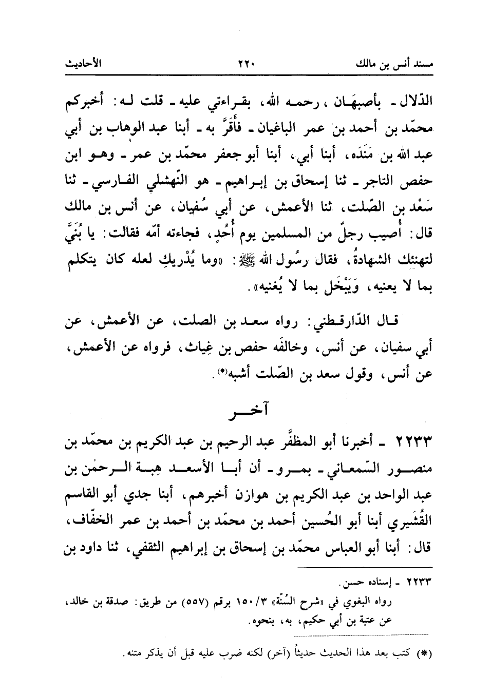 2233 - أَخْبَرَنَا أَبُو الْمُظَفَّرِ عَبْدُ الرَّحِيمِ بْنُ عَبْدِ الْكَرِيمِ بْنِ مُحَمَّدِ بْنِ مَنْصُورٍ السَّمْعَانِيُّ بِمَرْوَ أَنَّ أَبَا الأَسْعَدِ هِبَةَ الرَّحْمَنِ بْنَ عَبْدِ الْوَاحِد بن عبد الْكَرِيم بن هوَازن أخبرهُ أبنا جَدِّي أَبُو الْقَاسِمِ الْقُشَيْرِيُّ أبنا أَبُو الْحُسَيْنِ أَحْمَدُ بْنُ مُحَمَّدِ بْنِ أَحْمَدَ بْنِ عُمَرَ الْخَفَّافُ قَالَ أبنا أَبُو الْعَبَّاسِ مُحَمَّدُ بْنُ إِسْحَاقَ بْنِ إِبْرَاهِيمَ الثَّقَفِيُّ ثَنَا دَاوُدُ بْنُ رُشَيْدٍ أَبُو الْفَضْلِ ثَنَا بَقِيَّةُ بْنُ الْوَلِيدِ عَنْ عُتْبَةَ بْنِ أَبِي حَكِيمٍ قَالَ حَدَّثَنِي طَلْحَةُ بْنُ نَافِعٍ قَالَ سَمِعْتُ أَنَسَ بْنَ مَالِكٍ وَجَابِرَ بْنَ عَبْدِ اللَّهِ قَالا كُنَّا مَعَ رَسُولِ اللَّهِ