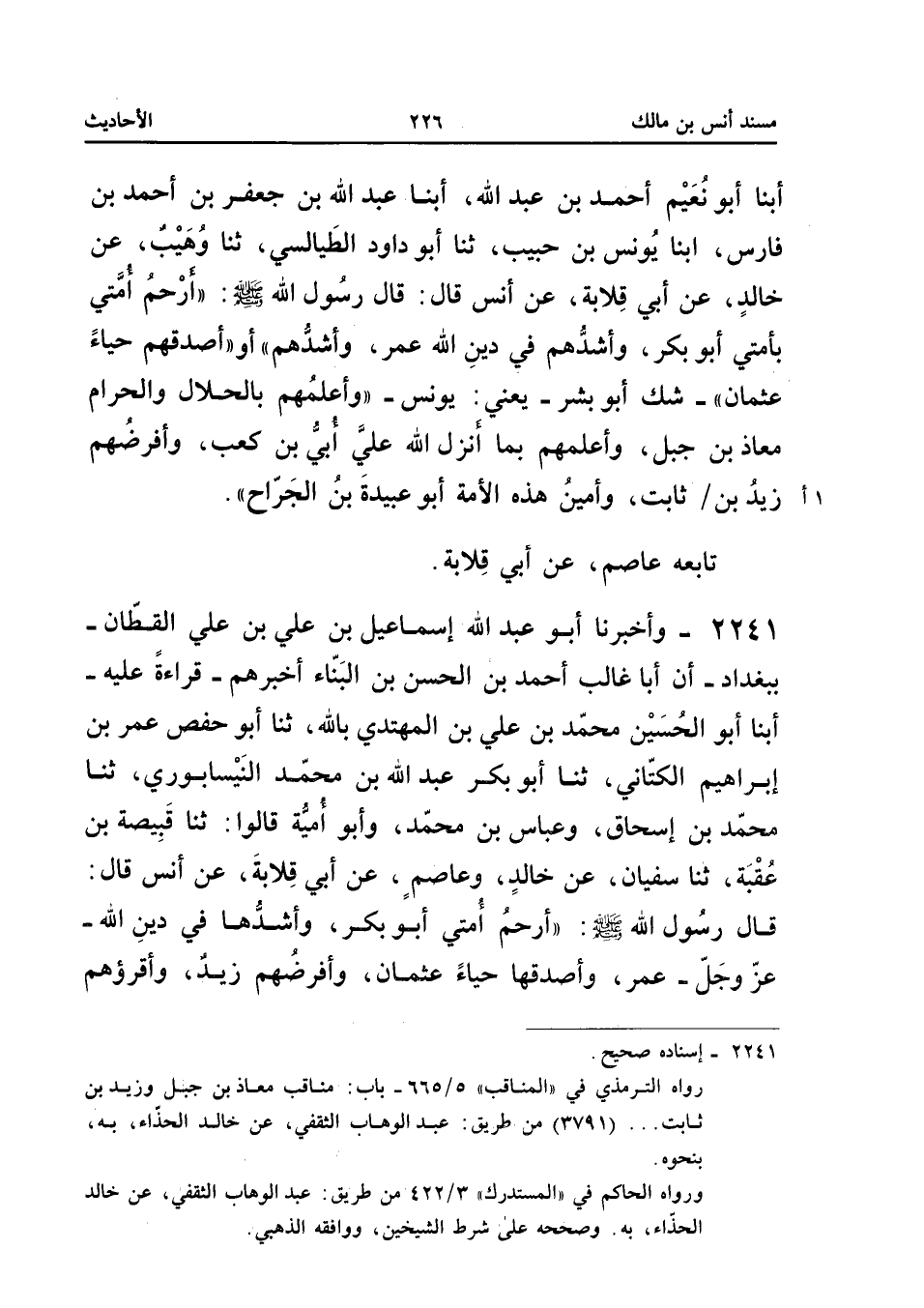 صَلَّى اللَّهُ عَلَيْهِ وَسَلَّمَ أَرْحَمُ أُمَّتِي بِأُمَّتِي أَبُو بَكْرٍ وَأَشَدُّهُمْ فِي دِينِ اللَّهِ عُمَرُ وَأَشَدُّهُمْ أَوْ أَصْدَقُهُمْ حَيَاءً عُثْمَانُ شَكَّ أَبُو بِشْرٍ يَعْنِي يُونُسَ وَأَعْلَمُهُمْ بِالْحَلالِ وَالْحَرَامِ مُعَاذُ بن جبل وأعلمه بِمَا أَنْزَلَ اللَّهُ عَلَيَّ أُبَيُّ بْنُ كَعْبٍ وَأَفْرَضُهُمْ زَيْدُ بْنُ ثَابِتٍ وَأَمِينُ هَذِهِ الأُمَّةِ أَبُو عُبَيْدَةَ بْنُ الْجَرَّاحِ تَابَعَهُ عَاصِمٌ عَنْ أبي قلَابَة إِسْنَاده صَحِيح
