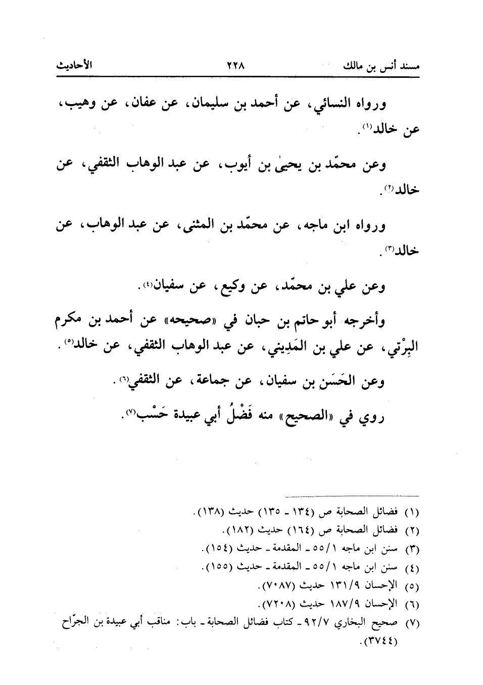 وَرَوَاهُ النَّسَائِيُّ عَنْ أَحْمَدَ بْنِ سُلَيْمَانَ عَنْ عَفَّانَ عَنْ وُهَيْبٍ عَنْ خَالِدٍ وَعَنْ مُحَمَّدِ بْنِ يَحْيَى بْنِ أَيُّوبَ عَنْ عَبْدِ الْوَهَّابِ الثَّقَفِيِّ عَنْ خَالِدٍ وَرَوَاهُ ابْنُ مَاجَهْ عَنْ مُحَمَّدِ بْنِ الْمُثَنَّى عَنْ عَبْدِ الْوَهَّابِ عَنْ خَالِدٍ وَعَنْ عَلِيِّ بْنِ مُحَمَّدٍ عَنْ وَكِيعٍ عَنْ سُفْيَانَ وَأَخْرَجَهُ أَبُو حَاتِمِ بْنُ حِبَّانَ فِي صَحِيحِهِ عَنْ أَحْمَدَ بْنِ مُكْرِمٍ الْبِرْتِيِّ عَن عَليّ بن الْمَدِينِيِّ عَنْ عَبْدِ الْوَهَّابِ الثَّقَفِيِّ عَنْ خَالِدٍ وَعَنِ الْحَسَنِ بْنِ سُفْيَانَ عَنْ جَمَاعَةً عَنِ الثَّقَفِيِّ رُوِيَ فِي الصَّحِيحِ مِنْهُ فَضْلُ أَبِي عُبَيْدَة حسب