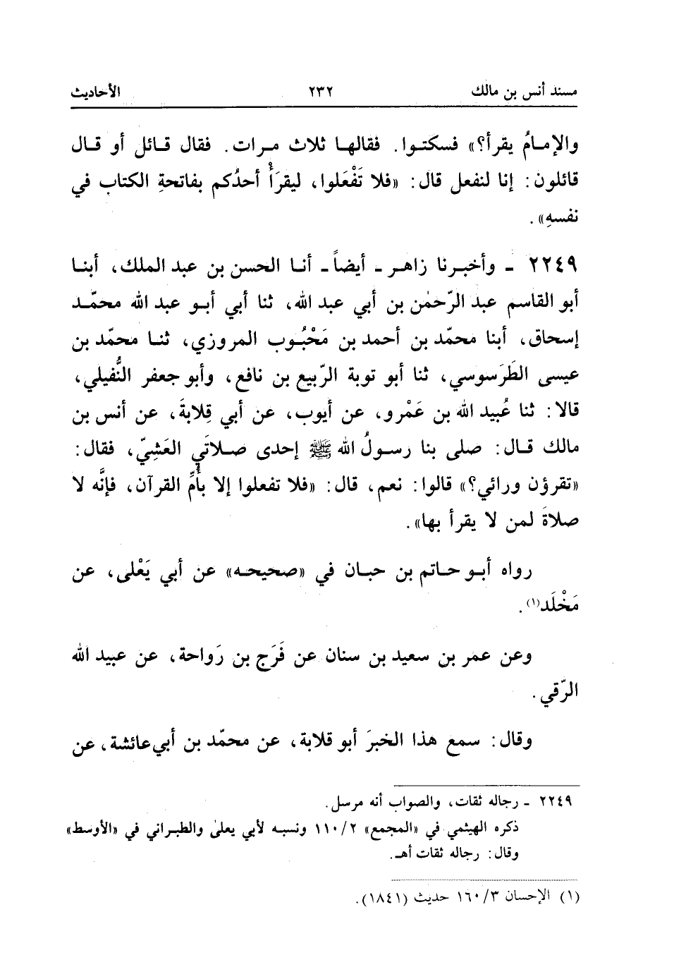 2249 - وَأَخْبَرَنَا زَاهِرٌ أَيْضًا أَنا الْحَسَنُ بْنُ عَبْدِ الْمَلِكِ أبنا أَبُو الْقَاسِمِ عَبْدُ الرَّحْمَنِ بْنُ أَبِي عَبْدِ اللَّهِ ثَنَا أَبِي أَبُو عَبْدِ الله مُحَمَّد إِسْحَاقَ أبنا مُحَمَّدُ بْنُ أَحْمَدَ بْنِ مَحْبُوبٍ الْمَرْوَزِيُّ ثَنَا مُحَمَّدُ بْنُ عِيسَى الطَّرَسُوسِيُّ ثَنَا أَبُو تَوْبَةَ الرَّبِيعُ بْنُ نَافِعٍ وَأَبُو جَعْفَرٍ النُّفَيْلِيُّ قَالا ثَنَا عُبَيْدُ اللَّهِ بْنُ عَمْرٍو عَنْ أَيُّوبَ عَنْ أَبِي قِلابَةَ عَنْ أَنَسٍ بْنِ مَالِكٍ قَالَ صَلَّى بِنَا رَسُولُ اللَّهِ صَلَّى اللَّهُ عَلَيْهِ وَسَلَّمَ إِحْدَى صَلاتَيِ الْعَشِيِّ فَقَالَ تقرؤن وَرَائِي قَالُوا نَعَمْ قَالَ فَلا تَفْعَلُوا إِلا بِأم الْقُرْآن فَإِنَّهُ لاصلاة لِمَنْ لَا يَقْرَأُ بِهَا رَوَاهُ أَبُو حَاتِمِ بْنُ حِبَّانَ فِي صَحِيحِهِ عَنْ أَبِي يَعْلَى عَنْ مَخْلَدٍ وَعَنْ عُمَرَ بْنِ سَعِيدِ بْنِ سِنَانٍ عَنْ فَرَجِ بْنِ رَوَاحَةَ عَنْ عُبَيْدِ اللَّهِ الرَّقِّيِّ وَقَالَ سَمِعَ هَذَا الْخَبَرَ أَبُو قِلابَةَ عَنْ مُحَمَّدِ بْنِ أَبِي عَائِشَةَ عَنْ