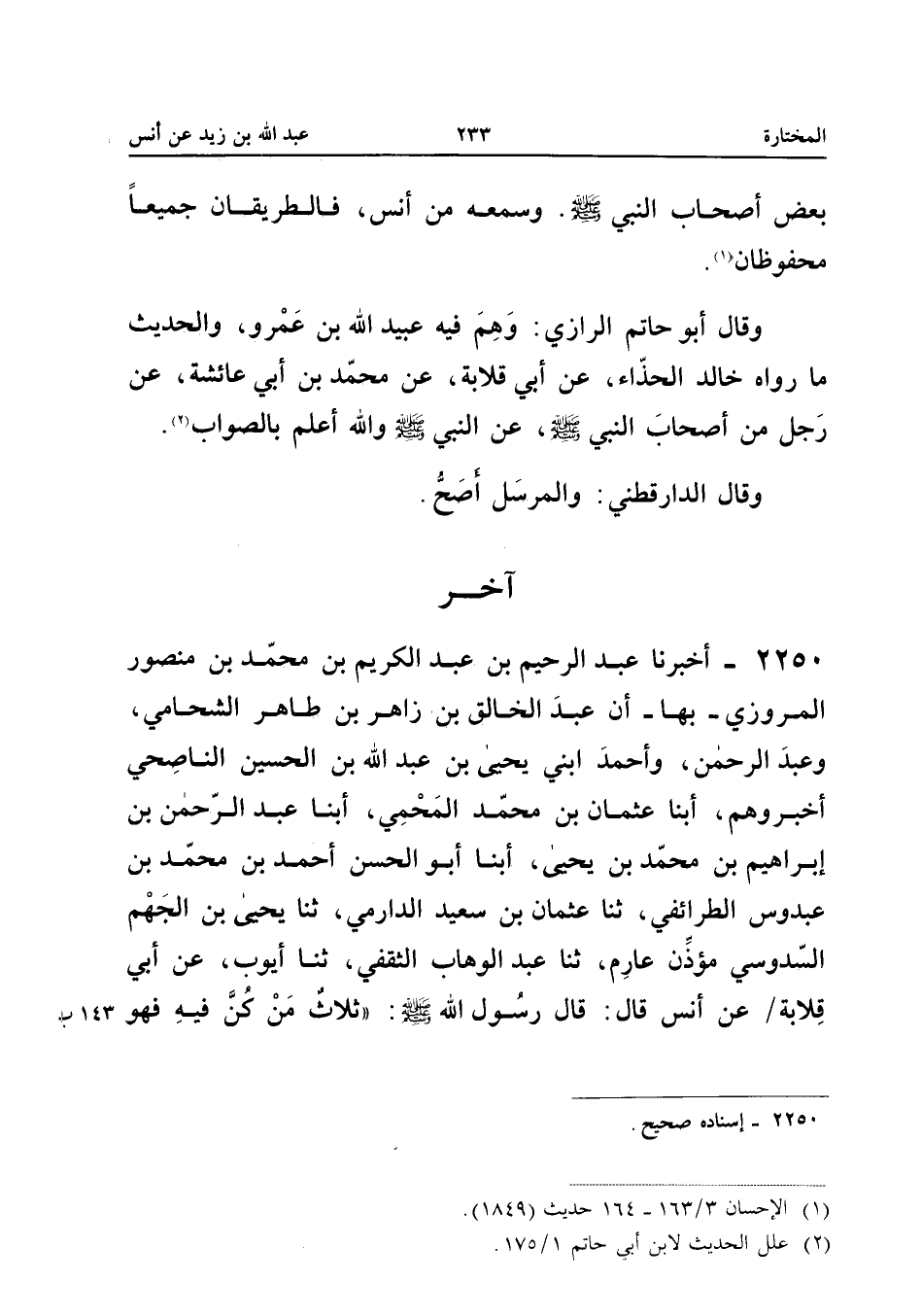 2250 - أَخْبَرَنَا عَبْدُ الرَّحِيمِ بْنُ عَبْدِ الْكَرِيمِ بْنِ مُحَمَّدِ بْنِ مَنْصُورٍ الْمَرْوَزِيُّ بِهَا أَنَّ عَبْدَ الْخَالِق بن زَاهِر بن طَاهِر الشحامي وَعبد الرَّحْمَنِ وَأَحْمَدَ ابْنَيْ يَحْيَى بْنِ عَبْدِ اللَّهِ بْنِ الْحُسَيْنِ النَّاصِحِيِّ أَخْبَرُوهُمْ أبنا عُثْمَانُ بْنُ مُحَمَّدٍ الْمَحْمِيُّ أبنا عَبْدُ الرَّحْمَنِ بْنُ إِبْرَاهِيمَ بْنِ مُحَمَّدِ بْنِ يَحْيَى أبنا أَبُو الْحَسَنِ أَحْمَدُ بْنُ مُحَمَّدِ بْنِ عَبْدُوسَ الطَّرَائِفِيُّ ثَنَا عُثْمَانُ بْنُ سَعِيدٍ الدَّارِمِيُّ ثَنَا يَحْيَى بْنُ الْجَهْمِ السَّدُوسِيُّ مُؤَذِّنُ عَارِمٍ ثَنَا عَبْدُ الْوَهَّابِ الثَّقَفِيُّ ثَنَا أَيُّوبُ عَنْ أَبِي قِلابَةَ عَنْ أَنَسٍ قَالَ قَالَ رَسُولُ اللَّهِ صَلَّى اللَّهُ عَلَيْهِ وَسَلَّمَ ثَلاثٌ مَنْ كُنَّ فِيهِ فَهُوَ