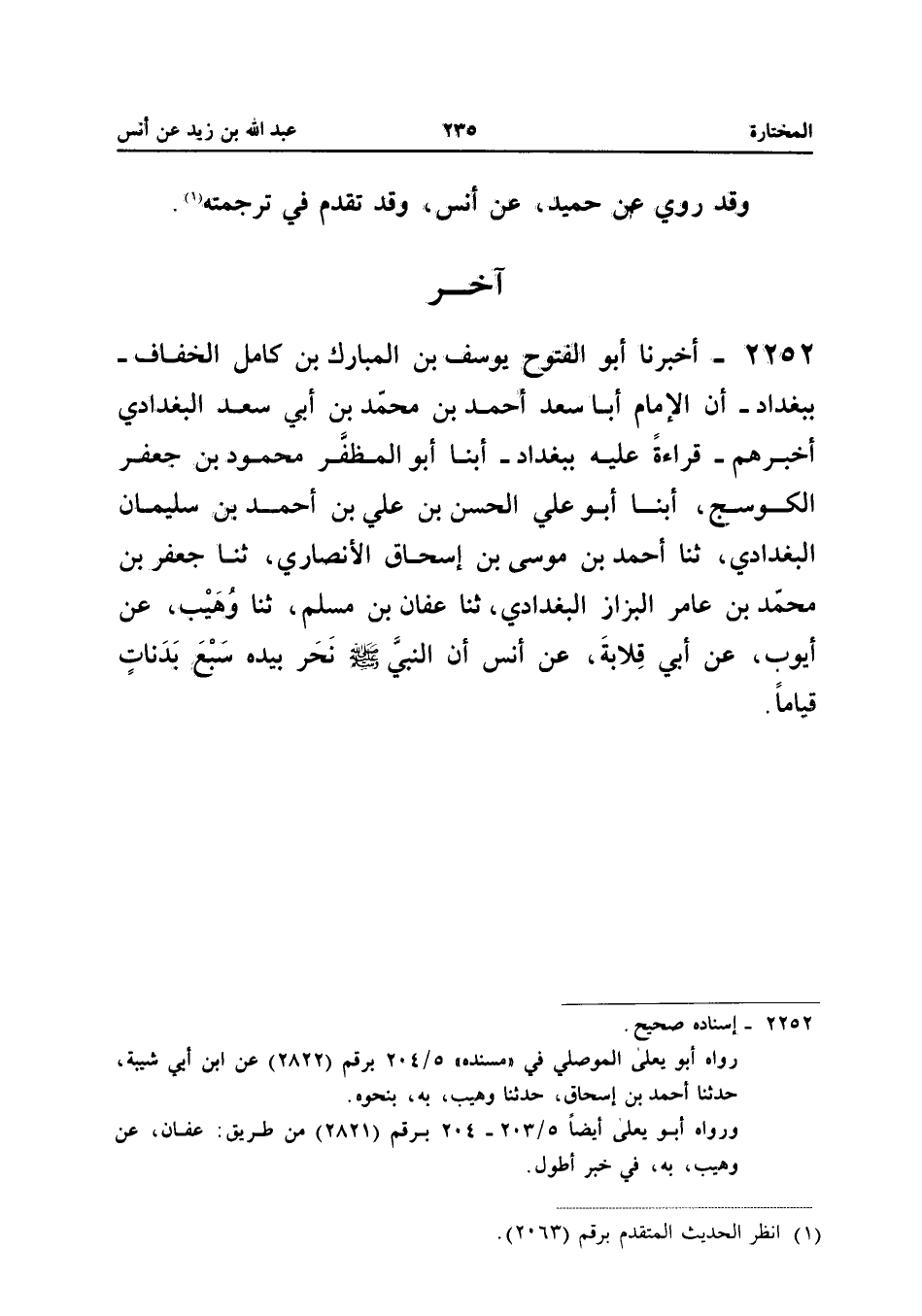 2252 - أَخْبَرَنَا أَبُو الْفُتُوحِ يُوسُفُ بْنُ الْمُبَارَكِ بْنِ كَامِلٍ الْخَفَّافُ بِبَغْدَادَ أَنَّ الإِمَامَ أَبَا سَعْدٍ أَحْمَدَ بْنَ مُحَمَّدِ بْنِ أَبِي سَعْدٍ الْبَغْدَادِيَّ أَخْبَرَهُمْ قِرَاءَةً عَلَيْهِ بِبَغْدَادَ أبنا أَبُو الْمُظَفَّرِ مَحْمُودُ بْنُ جَعْفَرٍ الْكَوْسَجُ أبنا أَبُو عَلِيٍّ الْحسن بن عَليّ بن أَحْمد بنس لميان الْبَغْدَادِيُّ ثَنَا أَحْمَدُ بْنُ مُوسَى بْنِ إِسْحَاقَ الأَنْصَارِيُّ ثَنَا جَعْفَرُ بْنُ مُحَمَّدِ بْنِ عَامِرٍ الْبَزَّازُّ الْبَغْدَادِيُّ ثَنَا عَفَّانُ بْنُ مُسْلِمٍ ثَنَا وُهَيْبٌ عَنْ أَيُّوبَ عَنْ أَبِي قِلابَةَ عَنْ أَنَسٍ أَنَّ النَّبِيَّ صَلَّى اللَّهُ عَلَيْهِ وَسَلَّمَ نَحَرَ بِيَدِهِ سَبْعَ بَدَنَاتٍ قِيَامًا