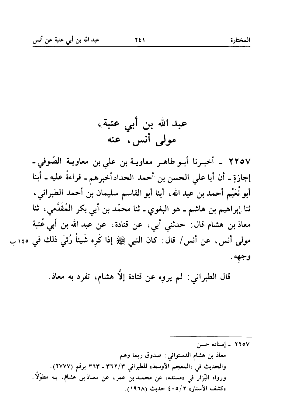 2257 - أَخْبَرَنَا أَبُو طَاهِرٍ مُعَاوِيَةُ بْنُ عَلِيِّ بْنِ مُعَاوِيَةَ الصُّوفِيُّ إِجَازَةً أَنَّ أَبَا عَلِيٍّ الْحَسَنَ بْنَ أَحْمَدَ الْحَدَّادَ أَخْبَرَهُمْ قِرَاءَةً عَلَيْهِ أبنا أَبُو نُعَيْمٍ أَحْمَدُ بْنُ عَبْدِ اللَّهِ أبنا أَبُو الْقَاسِمِ سُلَيْمَانُ بْنُ أَحْمَدَ الطَّبَرَانِيُّ ثَنا إِبْرَاهِيمُ بْنُ هَاشِمٍ هُوَ الْبَغَوِيُّ ثَنَا مُحَمَّدُ بْنُ أَبِي بَكْرٍ الْمُقَدَّمِيُّ ثَنَا مُعَاذُ بْنُ هِشَامٍ قَالَ حَدَّثَنِي أَبِي عَنْ قَتَادَةَ عَنْ عَبْدُ اللَّهِ بْنُ أَبِي عُتْبَةَ مَوْلَى أَنَسٍ عَنْ أَنَسٍ قَالَ كَانَ النَّبِيُّ صَلَّى اللَّهُ عَلَيْهِ وَسَلَّمَ إِذَا كَرِهَ شَيْئًا رُئِيَ ذَلِكَ فِي وَجْهِهِ