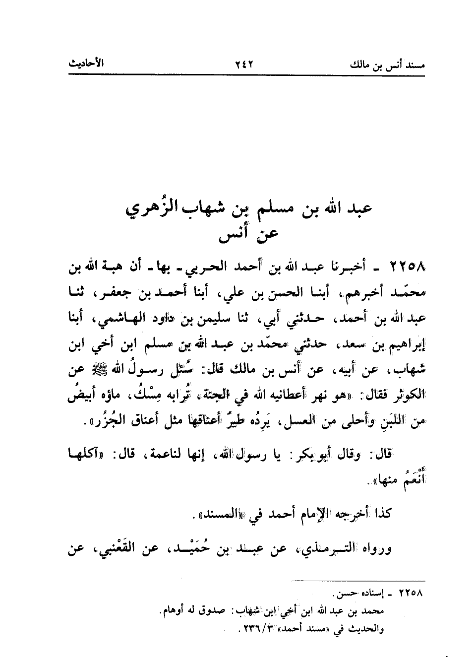 2258 - أَخْبَرَنَا عَبْدُ اللَّهِ بْنُ أَحْمَدَ الْحَرْبِيُّ بِهَا أَنَّ هِبَةَ اللَّهِ بْنَ مُحَمَّدٍ أَخْبَرَهُمْ أبنا الْحَسَنُ بْنُ عَلِيٍّ ابْنَا أَحْمَدَ بْنِ جَعْفَرٍ ثَنَا عَبْدُ اللَّهِ بْنُ أَحْمَدَ حَدَّثَنِي أَبِي ثَنَا سُلَيْمَانُ بْنُ دَاوُدَ الْهَاشِمِيُّ أبنا إِبْرَاهِيمُ بْنُ سَعْدٍ حَدَّثَنِي مُحَمَّدُ بْنُ عَبْدِ اللَّهِ بْنِ مُسْلِمٍ ابْنُ أَخِي ابْنِ شِهَابٍ عَنْ أَبِيهِ عَنْ أَنَسِ بْنِ مَالِكٍ قَالَ سُئِلَ رَسُولِ اللَّهِ صَلَّى اللَّهُ عَلَيْهِ وَسَلَّمَ عَنْ الْكَوْثَرِ فَقَالَ هُوَ نَهْرٌ أَعْطَانِيهِ اللَّهُ فِي الْجَنَّةِ تُرَابُهُ مِسْكٌ مَاؤُهُ أَبْيَضُ مِنَ اللَّبَنِ وَأَحْلَى مِنَ الْعَسَلِ يَرِدُهُ طَيْرٌ أَعْنَاقُهَا مِثْلَ أَعْنَاقِ الْجُزُرِ قَالَ وَقَالَ أَبُو بَكْرٍ يَا رَسُولَ اللَّهِ إِنَّهَا لَنَاعِمَةٌ قَالَ آكِلُهَا أَنْعَمُ مِنْهَا