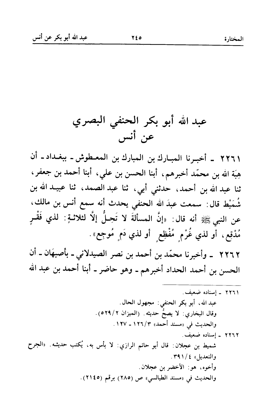 2261 - أَخْبَرَنَا الْمُبَارَكُ بْنُ الْمُبَارَكِ بْنِ الْمَعْطُوشِ بِبَغْدَادَ أَنَّ هِبَةَ اللَّهِ بْنَ مُحَمَّدٍ أَخْبَرَهُمْ أبنا الْحَسَنُ بْنُ عَلِيٍّ ابْنَا أَحْمَدَ بْنِ جَعْفَرٍ ثَنَا عَبْدُ اللَّهِ بْنُ أَحْمَدَ حَدَّثَنِي أَبِي ثَنَا عَبْدُ الصَّمَدِ ثَنَا عُبَيْدُ اللَّهِ بْنُ شُمَيْطٍ قَالَ سَمِعْتُ عَبْدَ اللَّهِ الْحَنَفِيَّ يُحَدِّثُ أَنَّهُ سَمِعَ أَنَسَ بْنَ مَالِكٍ عَنِ النَّبِيِّ صَلَّى اللَّهُ عَلَيْهِ وَسَلَّمَ أَنَّهُ قَالَ إِنَّ الْمَسْأَلَةَ لَا تَحِلُّ إِلا لِثَلاثَةٍ لِذِي فَقْرٍ مُدْقِعٍ أَوْ لِذِي غُرْمٍ مُفْظِعٍ أَوْ لِذِي دم موجع إِسْنَاده ضَعِيف