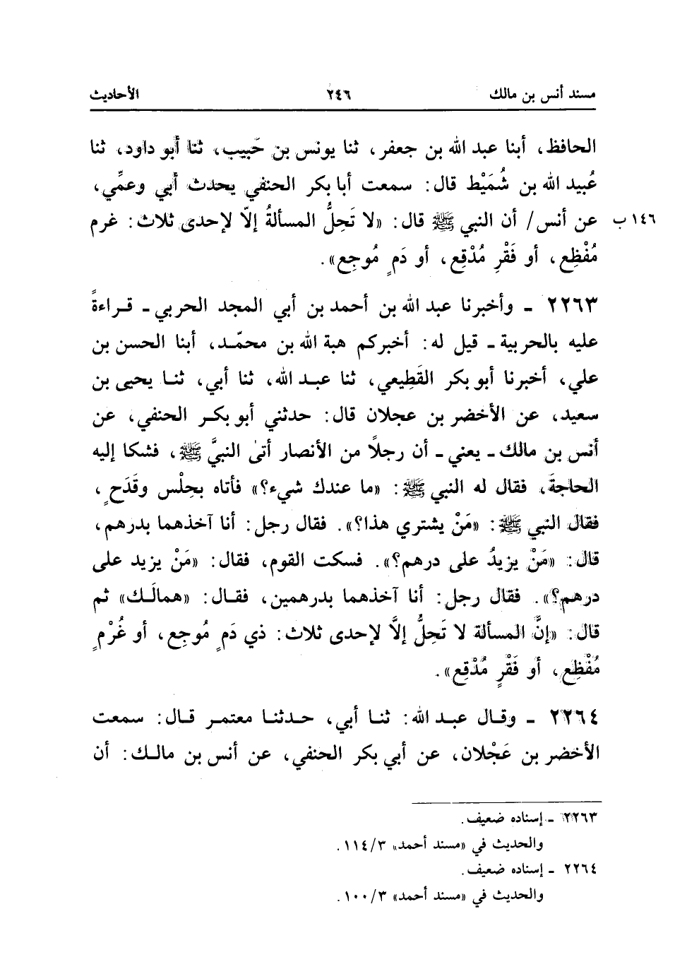 2263 - وَأَخْبَرَنَا عَبْدُ اللَّهِ بْنُ أَحْمَدَ بْنِ أَبِي الْمَجْدِ الْحَرْبِيُّ قِرَاءَةً عَلَيْهِ بِالْحَرْبِيَّةِ قِيلَ لَهُ أَخْبَرَكُمْ هِبَةُ اللَّهِ بْنُ مُحَمَّدٍ أبنا الْحَسَنُ بْنُ عَلِيٍّ أَخْبَرَنَا أَبُو بَكْرٍ الْقَطِيعِيُّ ثَنَا عَبْدُ اللَّهِ ثَنَا أَبِي ثَنَا يَحْيَى بْنُ سَعِيدٍ عَنِ الأَخْضَرِ بْنِ عَجْلانَ قَالَ حَدَّثَنِي أَبُو بَكْرٍ الْحَنَفِيُّ عَنْ أَنَسِ بْنِ مَالِكٍ يَعْنِي أَنَّ رَجُلا مِنَ الأَنْصَارِ أَتَى النَّبِيَّ صَلَّى اللَّهُ عَلَيْهِ وَسَلَّمَ فَشَكَا إِلَيْهِ الْحَاجَةَ فَقَالَ لَهُ النَّبِيُّ صَلَّى اللَّهُ عَلَيْهِ وَسَلَّمَ مَا عِنْدَكَ شَيْءٌ فَأَتَاهُ بِحِلْسٍ وَقَدَحٍ فَقَالَ النَّبِيُّ صَلَّى اللَّهُ عَلَيْهِ وَسَلَّمَ مَنْ يَشْتَرِي هَذَا فَقَالَ رَجُلٌ أَنَا آخُذُهُمَا بِدِرْهَمٍ قَالَ مَنْ يَزِيدُ عَلَى دِرْهَمٍ فَسَكَتَ الْقَوْمُ فَقَالَ مَنْ يَزِيدُ عَلَى دِرْهَمٍ فَقَالَ رَجُلٌ أَنَا آخُذُهُمَا بِدِرْهَمَيْنِ فَقَالَ هُمَا لَكَ ثُمَّ قَالَ إِنَّ الْمَسْأَلَةَ لَا تَحِلُّ إِلا لإِحْدَى ثَلاثٍ ذِي دَمٍ مُوجِعٍ أَوْ غُرْمٍ مُفْظِعٍ أَوْ فقر مدقع إِسْنَاده ضَعِيف