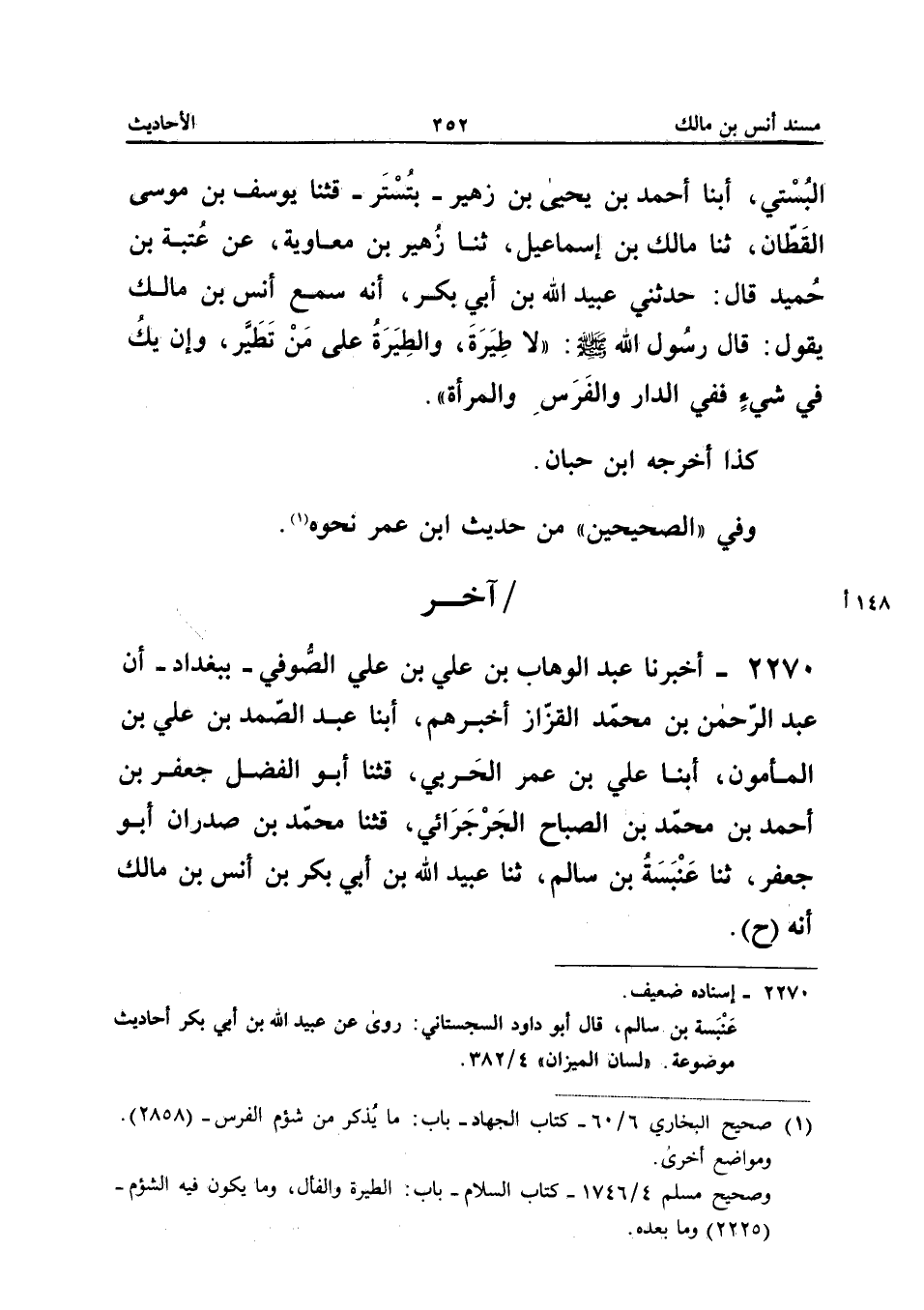 2270 - أَخْبَرَنَا عَبْدُ الْوَهَّابِ بْنُ عَلِيِّ بْنِ عَلِيٍّ الصُّوفِيُّ بِبَغْدَادَ أَنَّ عَبْدَ الرَّحْمَنِ بْنَ مُحَمَّدِ الْقَزَّازَ أَخْبَرَهُمْ أبنا عَبْدُ الصَّمَدِ بْنُ عَلِيِّ بْنِ الْمَأْمُونِ أبنا عَلِيُّ بْنُ عُمَرَ الْحَرْبِيُّ قثنا أَبُو الْفَضْلِ جَعْفَرُ بْنُ أَحْمَدَ بْنِ مُحَمَّدِ بْنِ الصَّبَّاحِ الْجَرْجَرَائِيُّ قثنا مُحَمَّدُ بْنُ صُدْرَانَ أَبُو جَعْفَرٍ ثَنَا عَنْبَسَةُ بْنُ سَالِمٍ ثَنَا عُبَيْدُ اللَّهِ بْنُ أَبِي بَكْرِ بْنِ أنس بن مَالك أَنه (ح) إِسْنَاده ضَعِيف
