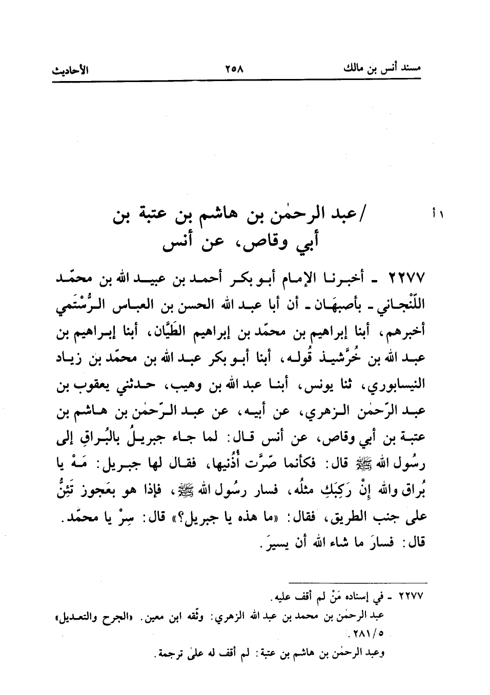2277 - أَخْبَرَنَا الإِمَامُ أَبُو بَكْرٍ أَحْمَدُ بْنُ عُبَيْدِ اللَّهِ بْنِ مُحَمَّدٍ اللَّنْجَانِيُّ بِأَصْبَهَانَ أَنَّ أَبَا عَبْدِ اللَّهِ الْحَسَنَ بْنَ الْعَبَّاسِ الرُّسْتُمِيَّ أَخْبَرَهُمْ أبنا إِبْرَاهِيمُ بْنُ مُحَمَّدِ بْنِ إِبْرَاهِيمَ الطَّيَّانُ أبنا إِبْرَاهِيمُ بْنُ عَبْدِ اللَّهِ بْنِ خُرَّشِيذَ قَوْلَهُ أبنا أَبُو بَكْرٍ عَبْدُ اللَّهِ بْنُ مُحَمَّدِ بْنِ زِيَادٍ النَّيْسَابُورِيُّ ثَنَا يُونُسُ أبنا عَبْدُ اللَّهِ بْنُ وُهَيْبٍ حَدَّثَنِي يَعْقُوبُ بْنُ عبد الرَّحْمَن الزُّهْرِيُّ عَنْ أَبِيهِ عَنْ عَبْدِ الرَّحْمَنِ بْنِ هَاشم بن عتبَة بن [أَي وَقاص عَن أنس قَالَ لم جَاءَ جِبْرِيلُ بِالْبُرَاقِ إِلَى رَسُولِ اللَّهِ صَلَّى اللَّهُ عَلَيْهِ وَسَلَّمَ قَالَ فَكَأَنَّمَا صَرَّتْ أُذُنَيْهَا فَقَالَ لَهَا جِبْرِيلُ مَهْ يَا بُرَاقُ وَاللَّهِ إِنْ رَكِبَكَ مِثْلُهُ فَسَارَ رَسْوُلُ اللَّهِ صَلَّى اللَّهُ عَلَيْهِ وَسَلَّمَ فَإِذَا هُوَ بِعَجُوزٍ تَئِنُّ عَلَى جَنْبِ الطَّرِيقِ فَقَالَ مَا هَذِهِ يَا جِبْرِيلُ قَالَ سِرْ يَا مُحَمَّدُ قَالَ فَسَارَ مَا شَاءَ اللَّهُ أَنْ يَسِيرَ