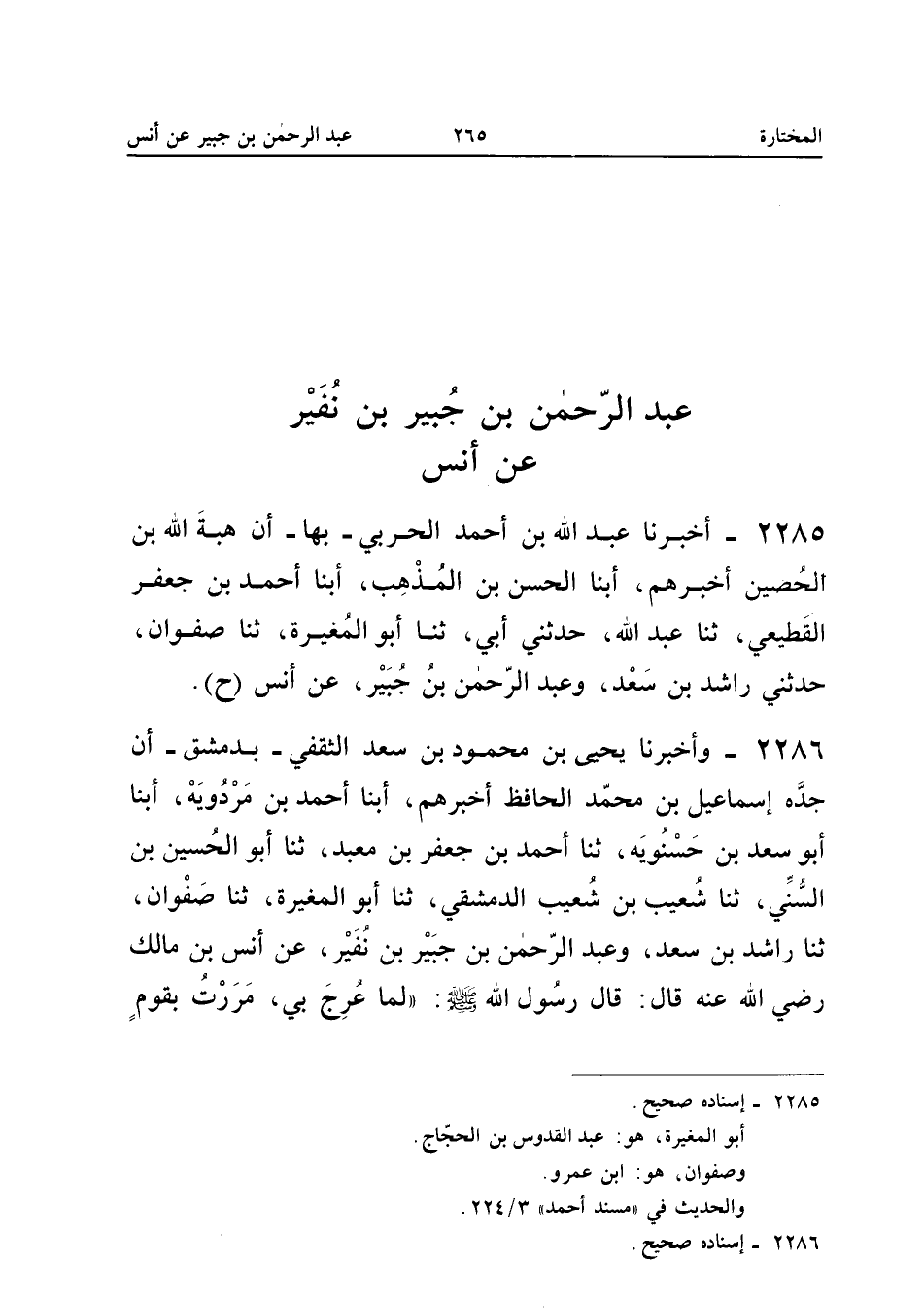 2285 - أَخْبَرَنَا عَبْدُ اللَّهِ بْنُ أَحْمَدَ الْحَرْبِيُّ بِهَا أَنَّ هِبَةَ اللَّهِ بْنَ الْحُصَيْنِ أَخْبَرَهُمْ أبنا الْحَسَنُ بْنُ الْمُذْهِبِ أبنا أَحْمَدُ بْنُ جَعْفَرٍ الْقَطِيعِيُّ ثَنَا عَبْدُ اللَّهِ حَدَّثَنِي أَبِي ثَنَا أَبُو الْمُغِيرَةِ ثَنَا صَفْوَانُ حَدَّثَنِي رَاشِدُ بْنُ سعد وَعبد الرَّحْمَن بن جُبَير عَن أنس (ح) إِسْنَاده صَحِيح