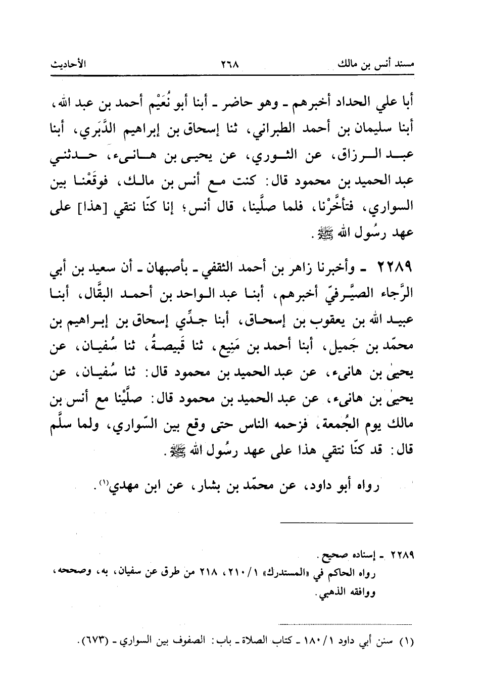 2289 - وأَخْبَرَنَا زَاهِرُ بْنُ أَحْمَدَ الثَّقَفِيُّ بِأَصْبَهَانَ أَنَّ سَعِيدَ بْنَ أَبِي الرَّجَاءِ الصَّيْرَفِيَّ أَخْبَرَهُمْ أبنا عَبْدُ الْوَاحِدِ بْنُ أَحْمَدَ الْبَقَّالُ أبنا عُبَيْدُ اللَّهُ بْنُ يَعْقُوبَ بْنِ إِسْحَاقَ أبنا جَدِّي إِسْحَاقُ بْنُ إِبْرَاهِيمَ بْنِ مُحَمَّدِ بْنِ جَمِيلٍ أبنا أَحْمَدُ بْنُ مَنِيعٍ ثَنَا قَبِيصَةُ ثَنَا سُفْيَانَ عَنْ يَحْيَى بْنِ هَانِئٍ عَنْ عَبْدِ الحميد بن مَحْمُود قَالَ ثَنَا سُفْيَانُ عَنْ يَحْيَى بْنِ هَانِئٍ عَنْ عَبْدِ الْحَمِيدِ بْنِ مَحْمُودٍ قَالَ صَلَّيْنَا مَعَ أَنَسِ بْنِ مَالِكٍ يَوْمَ الْجُمُعَةِ فَزَحَمَهُ النَّاسُ حَتَّى وَقَعَ بَيْنَ السَّوَارِي وَلَمَّا سَلَّمَ قَالَ قَدْ كُنَّا نَتَّقِي هَذَا عَلَى عَهْدِ رَسُولِ اللَّهِ صَلَّى اللَّهُ عَلَيْهِ وَسَلَّمَ