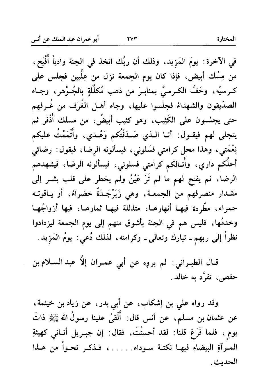 فِي الآخِرَةِ يَوْمَ الْمَزِيدِ وَذَلِكَ أَنَّ رَبَّكَ اتَّخَذَ فِي الْجَنَّةِ وَادِيًا أَفْيَحَ مِنْ مِسْكٍ أَبْيَضَ فَإِذَا كَانَ يَوْمُ الْجُمُعَةِ نَزَلَ مِنْ عِلِّيِّينَ فَجَلَسَ عَلَى كُرْسِيِّهِ وَحَفَّ الْكُرْسِيَّ بِمَنَابِرَ مِنْ ذَهَبٍ مُكَلَّلَةٍ بِالْجَوْهَرِ وَجَاءَ الصِّدِّيقُونَ وَالشُّهَدَاءُ فَجَلَسُوا عَلَيْهَا وَجَاءَ أَهْلُ الْغُرَفِ مِنْ غُرَفِهِمْ حَتَّى يَجْلِسُونَ عَلَى الْكَثِيبِ وَهُوَ كَثِيبٌ أَبْيَضُ مِنْ مِسْكٍ أَذْفَرَ ثُمَّ يَتَجَلَّى لَهُمْ فَيَقُولُ أَنَا الَّذِي صَدَقْتُكُمْ وَعْدِي وَأَتْمَمْتُ عَلَيْكُمْ نِعْمَتِي وَهَذَا مَحَلُّ كَرَامَتِي فَسَلُونِي فَيَسْأَلُونَهُ الرِّضَا فَيَقُولُ رضائي أحلكم دَاري وأنالكم كَرَامَتِي فَسَلُونِي فَيَسْأَلُونَهُ الرِّضَا فَيُشْهِدُهُمُ الرِّضَا ثُمَّ يَفْتَحُ لَهُمْ مَا لَمْ تَرَ عَيْنٌ وَلَمْ يَخْطُرْ عَلَى قَلْبِ بَشَرٍ إِلَى مِقْدَارِ مُنْصَرَفِهِمْ مِنَ الْجُمُعَةِ وَهِيَ زَبَرْجَدَةٌ خَضْرَاءُ أَوْ يَاقُوتَهٌ حَمْرَاءُ مُطَّرِدَةٌ فِيهَا أَنْهَارُهَا مُتَذَلِّلَةٌ فِيهَا ثِمَارُهَا فِيهَا أَزْوَاجُهَا وَخَدَمُهَا فَلَيْسَ هُمْ فِي الْجَنَّةِ بِأَشْوَقَ مِنْهُمْ إِلَى يَوْمِ الْجُمُعَةِ لِيَزْدَادُوا نَظَرًا إِلَى رَبِّهِمْ تَبَارَكَ وَتَعَالَى وَكَرَامَتِهِ لِذَلِكَ دُعِيَ يَوْمُ الْمَزِيدِ