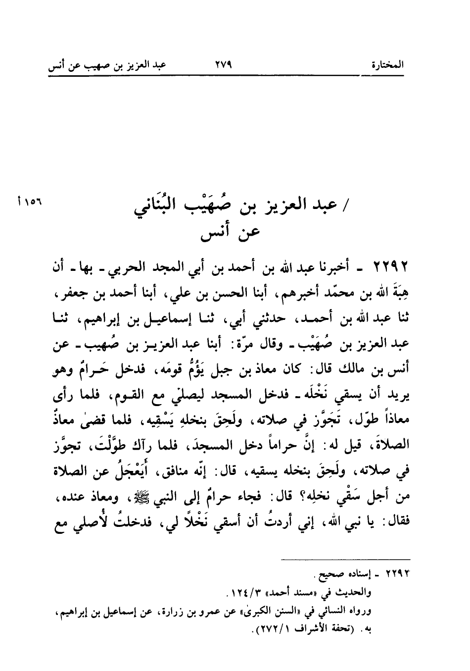 2292 - أَخْبَرَنَا عَبْدُ اللَّهِ بْنُ أَحْمَدَ بْنِ أَبِي الْمَجْدِ الْحَرْبِيُّ بِهَا أَنَّ هِبَةَ اللَّهِ بْنَ مُحَمَّدٍ أَخْبَرَهُمْ أبنا الْحَسَنُ بْنُ عَلِيٍّ أبنا أَحْمَدُ بْنُ جَعْفَرٍ ثَنَا عَبْدُ اللَّهِ بْنُ أَحْمَدَ حَدَّثَنِي أَبِي ثَنَا إِسْمَاعِيلُ بْنُ إِبْرَاهِيمَ ثَنَا عَبْدُ الْعَزِيزِ بْنُ صُهَيْبٍ وَقَالَ مَرَّةً أبنا عَبْدُ الْعَزِيزِ بْنُ صُهَيْبٍ عَنْ أَنَسِ بْنِ مَالِكٍ قَالَ كَانَ مُعَاذُ بْنُ جَبَلٍ يَؤُمُّ قَوْمَهُ فَدَخَلَ حَرَامٌ وَهُوَ يُرِيدُ أَنْ يَسْقِيَ نَخْلَهُ فَدَخَلَ الْمَسْجِدَ لِيُصَلِّيَ مَعَ الْقَوْمِ فَلَمَّا رَأَى مُعَاذًا طَوَّلَ تَجَوَّزَ فِي صَلاتِهِ وَلَحِقَ بَنَخْلِهِ يَسْقِيهِ فَلَمَّا قَضَى مُعَاذٌ الصَّلاةَ قِيلَ لَهُ إِنَّ حَرَامًا دَخَلَ الْمَسْجِدَ فَلَمَّا رَآكَ طَوَّلْتَ تَجَوَّزَ فِي صَلاتِهِ وَلَحِقَ بِنَخْلِهِ يَسْقِيهِ قَالَ إِنَّهُ مُنَافِقٌ أَيَعْجَلُ عَنِ الصَّلاةِ مِنْ أَجْلِ سَقْيِ نَخْلِهِ قَالَ فَجَاءَ حَرَامٌ إِلَى النَّبِيِّ صَلَّى اللَّهُ عَلَيْهِ وَسَلَّمَ وَمُعَاذٌ عِنْدَهُ فَقَالَ يَا نَبِيَّ اللَّهِ إِنِّي أَرَدْتُ أَنْ أَسْقِيَ نَخْلا لِي فَدَخَلْتُ لأُصَلِّيَ مَعَ