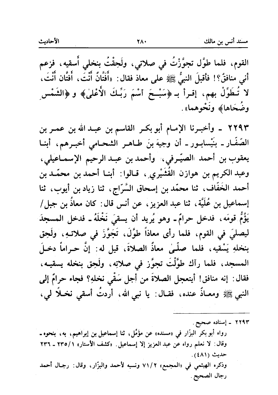 2293 - وَأَخْبَرَنَا الإِمَامُ أَبُو بَكْرٍ الْقَاسِمُ بْنُ عَبْدِ اللَّهِ بْنِ عُمَرَ بْنِ الصَّفَّارِ بِنَيْسَابُورَ أَنَّ وَجِيهَ بْنَ طَاهِرٍ الشَّحَّامِيَّ أَخْبَرَهُمْ أبنا يَعْقُوبُ بْنُ أَحْمَدَ الصَّيْرَفِيُّ وَأَحْمَدُ بْنُ عَبْدِ الرَّحِيمِ الإِسْمَاعِيلِيُّ وَعَبْدُ الْكَرِيمِ بْنُ هَوَازِنَ الْقُشَيْرِيُّ قَالُوا أبنا أَحْمَدُ بْنُ مُحَمَّدِ بْنِ أَحْمَدَ الْخَفَّافُ ثَنَا مُحَمَّدُ بْنُ إِسْحَاقَ السَّرَّاجُ ثَنَا زِيَادُ بن ايوب ثَنَا إِسْمَاعِيل بن عُلَيَّةَ ثَنَا عَبْدُ الْعَزِيزِ عَنْ أَنَسٍ قَالَ كَانَ مُعَاذُ بْنُ جَبَلٍ يَؤُمُّ قَوْمَهُ فَدَخَلَ حرَام وَهُوَ يرد أَنْ يَسْقِيَ نَخْلَهُ فَدَخَلَ الْمَسْجِدَ لِيُصَلِّيَ فِي الْقَوْمِ فَلَمَّا رَأَى مُعَاذًا طَوَّلَ تَجَوَّزَ فِي صَلاتِهِ وَلَحِقَ بِنَخْلِهِ يَسْقِيهِ فَلَمَّا صَلَّى مُعَاذٌ الصَّلاةَ قِيلَ لَهُ إِنَّ حَرَامًا دَخَلَ الْمَسْجِدَ فَلَمَّا رَآكَ طَوَّلْتَ تَجَوَّزَ فِي صَلاتِهِ وَلَحِقَ بِنَخْلِهِ يَسْقِيهِ فَقَالَ إِنَّهُ مُنَافِقٌ أَيَتَعَجَّلُ الصَّلاةَ مِنْ أَجْلِ سَقْيِ نَخْلِهِ فَجَاءَ حَرَامٌ إِلَى النَّبِيِّ صَلَّى اللَّهُ عَلَيْهِ وَسَلَّمَ وَمُعَاذٌ عِنْدَهُ فَقَالَ يَا نَبِيَّ اللَّهِ أَرَدْتُ أَسْقِي نَخْلا لي