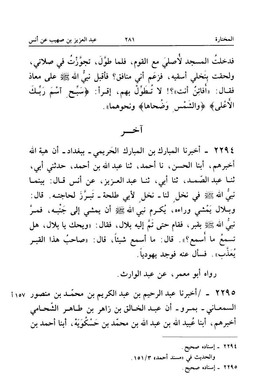 2294 - أَخْبَرَنَا الْمُبَارَكُ بْنُ الْمُبَارَكِ الْحَرِيمِيُّ بِبَغْدَادَ أَنَّ هَبَةَ اللَّهِ أَخْبَرَهُمْ أبنا الْحَسَنُ نَا أَحْمَدُ ثَنَا عَبْدُ اللَّهِ بْنُ أَحْمَدَ حَدَّثَنِي أَبِي ثَنَا عَبْدُ الصَّمَدِ ثَنَا أَبِي ثَنَا عَبْدُ الْعَزِيزِ عَنْ أَنَسٍ قَالَ بَيْنَمَا نَبِيُّ اللَّهِ صَلَّى اللَّهُ عَلَيْهِ وَسَلَّمَ فِي نَخْلٍ لَنَا نَخْلٍ لأَبِي طَلْحَةَ تَبَرَّزَ لِحَاجَتِهِ قَالَ وَبِلالٌ يَمْشِي وَرَاءَهُ يُكَرِّمُ نَبِيَّ اللَّهِ صَلَّى اللَّهُ عَلَيْهِ وَسَلَّمَ أَنْ يَمْشِي إِلَى جَنْبِهِ فَمَرَّ نَبِيُّ اللَّهِ صَلَّى اللَّهُ عَلَيْهِ وَسَلَّمَ بِقَبْرٍ فَقَامَ حَتَّى تَمَّ إِلَيْهِ بِلالٌ فَقَالَ وَيْحَكَ يَا بِلالُ هَلْ تَسْمَعُ مَا أَسْمَعُ قَالَ مَا أَسْمَعُ شَيْئًا قَالَ صَاحِبُ هَذَا الْقَبْرِ يُعَذَّبُ فَسَأَلَ عَنْهُ فَوُجِدَ يَهُودِيًّا
