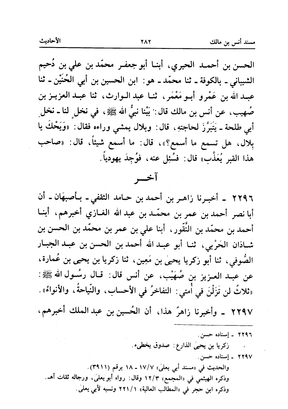 2296 - أَخْبَرَنَا زَاهِرُ بْنُ أَحْمَدَ بْنِ حَامِدٍ الثَّقَفِيُّ بِأَصْبَهَانَ أَنَّ أَبَا نَصْرٍ أَحْمَدَ بْنَ عُمَرَ بْنِ مُحَمَّدِ بْنِ عَبْدِ اللَّهِ الْغَازِي أَخْبَرَهُمْ أبنا أَحْمَدُ بْنُ مُحَمَّدِ بْنِ النَّقُّورِ أبنا عَلِيُّ بْنُ عُمَرِ بْنِ مُحَمَّدِ بْنِ الْحَسَنِ بْنِ شَاذَانَ الْحَرْبِيُّ ثَنَا أَبُو عَبْدِ اللَّهِ أَحْمَدُ بْنُ الْحَسَنِ بْنِ عَبْدِ الْجَبَّارِ الصُّوفِيُّ ثَنَا أَبُو زَكَرِيَّا يَحْيَى بْنُ مَعِينٍ ثَنَا زَكَرِيَّا بْنُ يَحْيَى بْنِ عُمَارَةَ عَنْ عَبْدِ الْعَزِيزِ بْنِ صُهَيْبٍ عَنْ أَنَسٍ قَالَ قَالَ رَسُولُ اللَّهِ صَلَّى اللَّهُ عَلَيْهِ وَسَلَّمَ ثَلاثٌ لَنْ تَزَلْنَ فِي أُمَّتِي التَّفَاخُرُ فِي الأحساب والنياحة والأنواء إِسْنَاده حسن