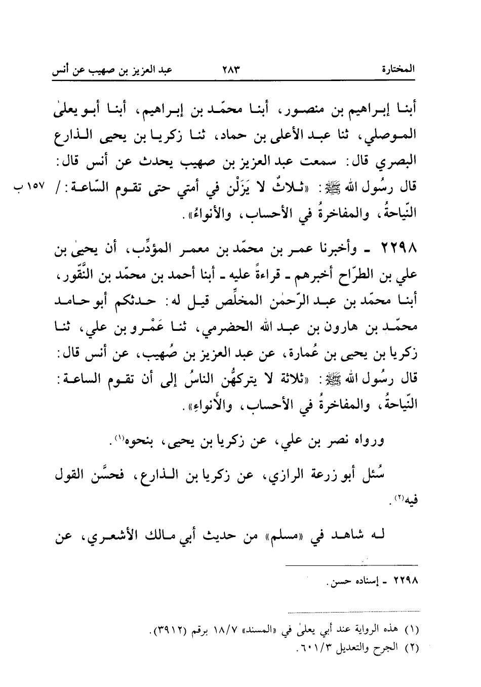 2298 - وَأَخْبَرَنَا عُمَرُ بْنُ مُحَمَّدِ بْنِ مَعْمَرٍ الْمُؤَدِّبُ أَنَّ يَحْيَى بْنَ عَلِيِّ بْنِ الطَّرَّاحِ أَخْبَرَهُمْ قِرَاءَةً عَلَيْهِ أبنا أَحْمَدُ بْنُ مُحَمَّدِ بْنِ النَّقُّورِ أبنا مُحَمَّدُ بْنُ عَبْدِ الرَّحْمَنِ الْمُخَلِّصُ قِيلَ لَهُ حَدَّثَكُمْ أَبُو حَامِدٍ مُحَمَّدُ بْنُ هَارُونَ بْنِ عَبْدِ اللَّهِ الْحَضْرَمِيُّ ثَنَا عَمْرُو بْنُ عَلِيٍّ ثَنَا زَكَرِيَّا بْنُ يَحْيَى بْنِ عُمَارَةَ عَنْ عَبْدِ الْعَزِيزِ بْنِ صُهَيْبٍ عَنْ أَنَسٍ قَالَ قَالَ رَسُولُ اللَّهِ صَلَّى اللَّهُ عَلَيْهِ وَسَلَّمَ ثَلاثَةٌ لَا يَتْرُكُهُنَّ النَّاسُ إِلَى أَنْ تَقُومَ السَّاعَةُ النِّيَاحَةُ وَالْمُفَاخَرَةُ فِي الأَحْسَابِ وَالأَنْوَاءُ