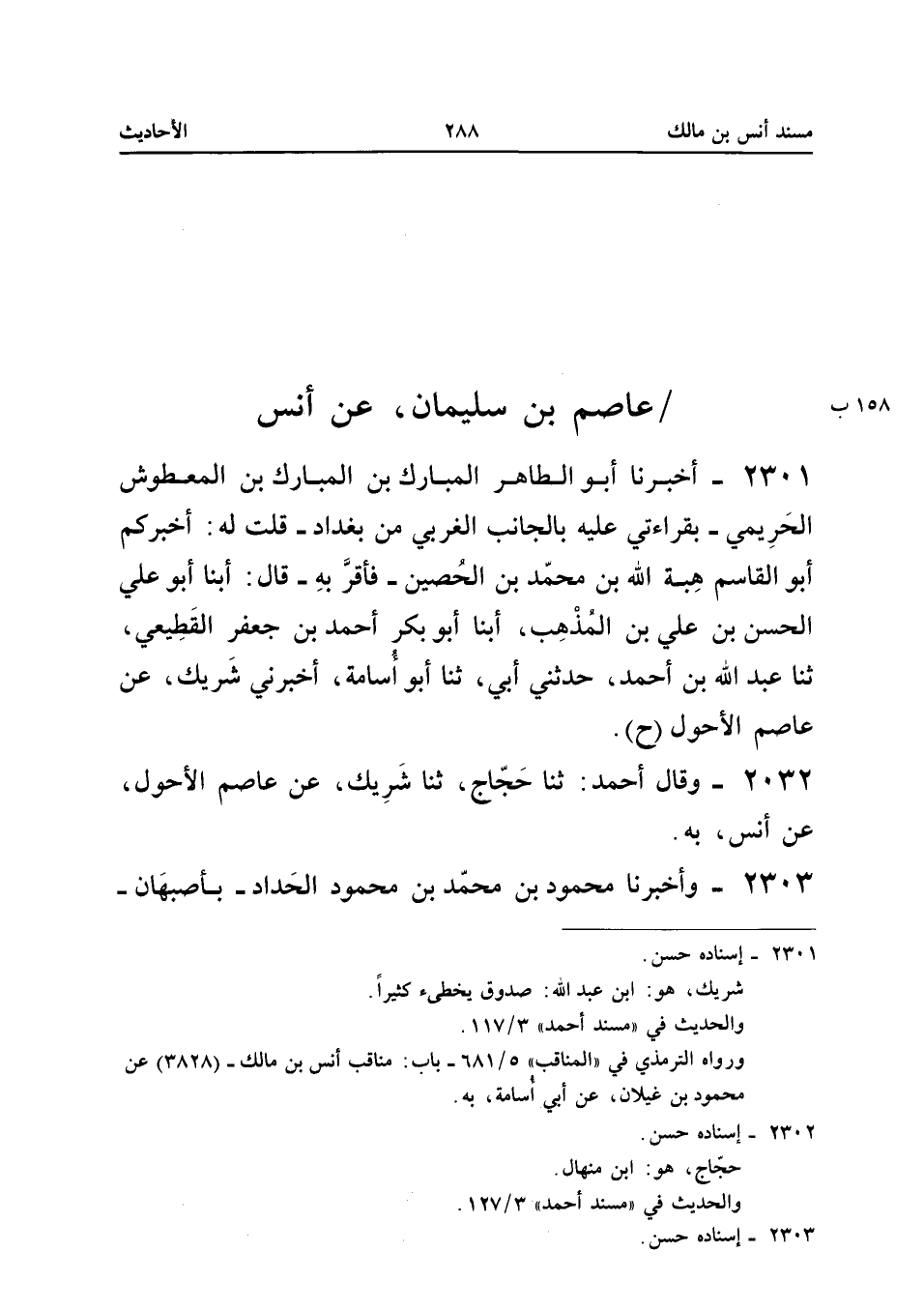 2301 - أَخْبَرَنَا أَبُو الطَّاهِرِ الْمُبَارَكُ بْنُ الْمُبَارَكِ بْنُ الْمَعْطُوشِ الْحَرِيمِيُّ بِقِرَاءَتِي عَلَيْهِ بِالْجَانِبِ الْغَرْبِيِّ مِنْ بَغْدَادَ قُلْتُ لَهُ أَخْبَرَكُمْ أَبُو الْقَاسِمِ هِبَةُ اللَّهِ بْنُ مُحَمَّدِ بْنِ الْحُصَيْنِ فَأَقَرَّ بِهِ قَالَ أبنا أَبُو عَلِيٍّ الْحَسَنُ بْنُ عَلِيِّ بْنِ الْمُذْهِبِ أبنا أَبُو بَكْرٍ أَحْمَدُ بْنُ جَعْفَرٍ الْقَطِيعِيُّ ثَنَا عَبْدُ اللَّهِ بْنُ أَحْمَدَ حَدَّثَنِي أَبِي ثَنَا أَبُو أُسَامَةَ أَخْبَرَنِي شَرِيكٌ عَن عَاصِم الْأَحول (ح) إِسْنَاده حسن