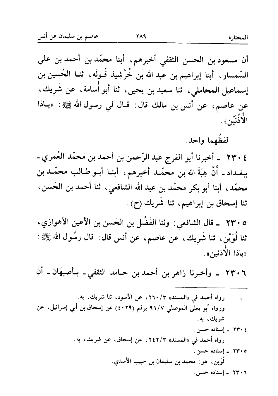 2305 - قَالَ الشَّافِعِيُّ وَثنا الْفَضْلُ بْنُ الْحَسَنِ بْنِ الأَعْيَنِ الأَهْوَازِيُّ ثَنَا لُوَيْنٌ ثَنَا شَرِيكٌ عَنْ عَاصِمٍ عَنْ أَنَسٍ قَالَ قَالَ رَسُولُ اللَّهِ صلى الله عَلَيْهِ وَسلم يَاذَا الْأُذُنَيْنِ إِسْنَاده حسن