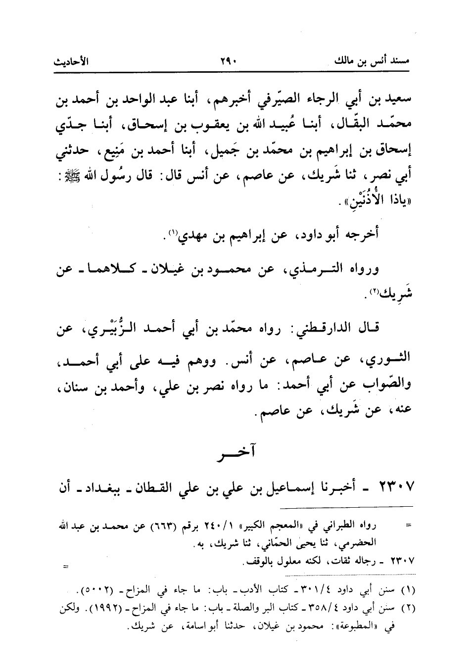 2307 - أَخْبَرَنَا إِسْمَاعِيلُ بْنُ عَلِيِّ بْنِ عَلِيٍّ الْقَطَّانُ بِبَغْدَادَ أَنَّ أَبَا غَالِبٍ أَحْمَدَ بْنَ الْحَسَنِ بْنِ الْبَنَّاءِ أَخْبَرَهُمْ أبنا أَبُو الْحُسَيْنِ مُحَمَّدُ بْنُ عَلِيِّ بْنِ الْمُهْتَدِي بِاللَّهِ ثَنَا أَبُو حَفْصٍ عُمَرُ بْنُ إِبْرَاهِيمَ الْكَتَّانِيُّ ثَنَا مُحَمَّدُ بْنُ هَارُونَ الْحَضْرَمِيُّ ثَنَا أَبُو هَاشِمٍ زِيَادُ بْنُ أَيُّوبَ ثَنَا أَبُو مُعَاوِيَةُ الضَّرِيرُ ثَنَا عَاصِمٌ الأَحْوَلُ عَنْ أَنَسِ بْنِ مَالِكٍ قَالَ سُئِلَ رَسُولُ اللَّهِ