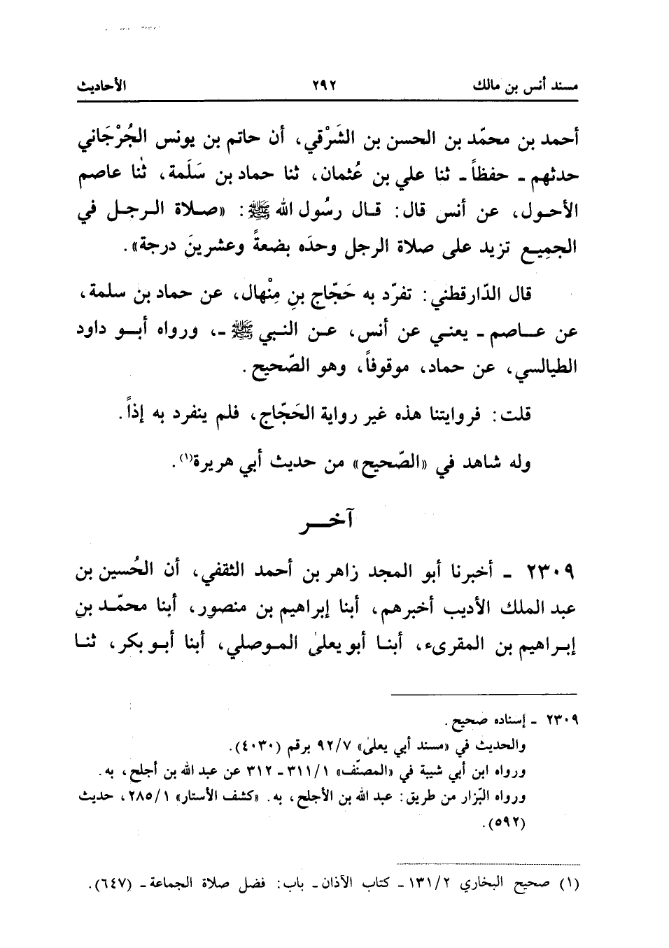 2309 - أَخْبَرَنَا أَبُو الْمَجْدِ زَاهِرُ بْنُ أَحْمَدَ الثَّقَفِيُّ أَنَّ الْحُسَيْنَ بْنَ عَبْدِ الْمَلِكِ الأَدِيبَ أَخْبَرَهُمْ أبنا إِبْرَاهِيمُ بْنُ مَنْصُورٍ أبنا مُحَمَّدُ بْنُ إِبْرَاهِيم بن الْمُقْرِئِ أبنا أَبُو يَعْلَى الْمَوْصِلِيُّ أبنا أَبُو بَكْرٍ ثَنَا عَبْدُ اللَّهِ بْنُ الأَجْلَحِ عَنْ عَاصِمٍ عَنْ أَنَسٍ قَالَ صَلَّى رَسُولُ اللَّهِ