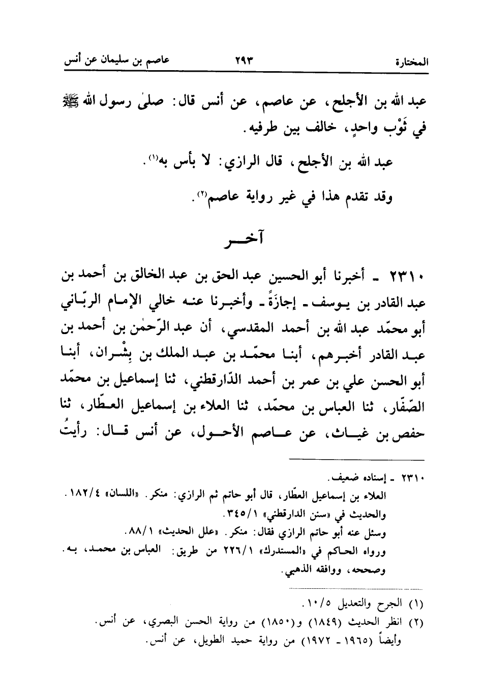 2310 - أَخْبَرَنَا أَبُو الْحُسَيْنِ عَبْدُ الْحَقِّ بْنُ عَبْدِ الْخَالِقِ بْنِ أَحْمَدَ بْنِ عَبْدِ الْقَادِرِ بْنِ يُوسُفَ إِجَازَةً وَأَخْبَرَنَا عَنْهُ خَالِي الإِمَامُ الرَّبَّانِيُّ أَبُو مُحَمَّدٍ عَبْدُ اللَّهِ بْنُ أَحْمَدَ الْمَقْدِسِيُّ أَنَّ عَبْدَ الرَّحْمَنِ بْنَ أَحْمَدَ بْنِ عَبْدِ الْقَادِرِ أَخْبَرَهُمْ أبنا مُحَمَّدُ بْنُ عَبْدِ الْمَلِكِ بْنِ بِشْرَانَ أبنا أَبُو الْحَسَنِ عَلِيُّ بْنُ عُمَرِ بْنِ أَحْمَدَ الدَّارَقُطْنِيُّ ثَنَا إِسْمَاعِيلُ بْنُ مُحَمَّدٍ الصَّفَّارُ ثَنَا الْعَبَّاسُ بْنُ مُحَمَّدٍ ثَنَا الْعَلاءُ بْنُ إِسْمَاعِيلَ الْعَطَّارُ ثَنَا حَفْصُ بْنُ غِيَاثٍ عَنْ عَاصِمٍ الأَحْوَلُ عَنْ أَنَسٍ قَالَ رَأَيْتُ رَسُولَ اللَّهِ