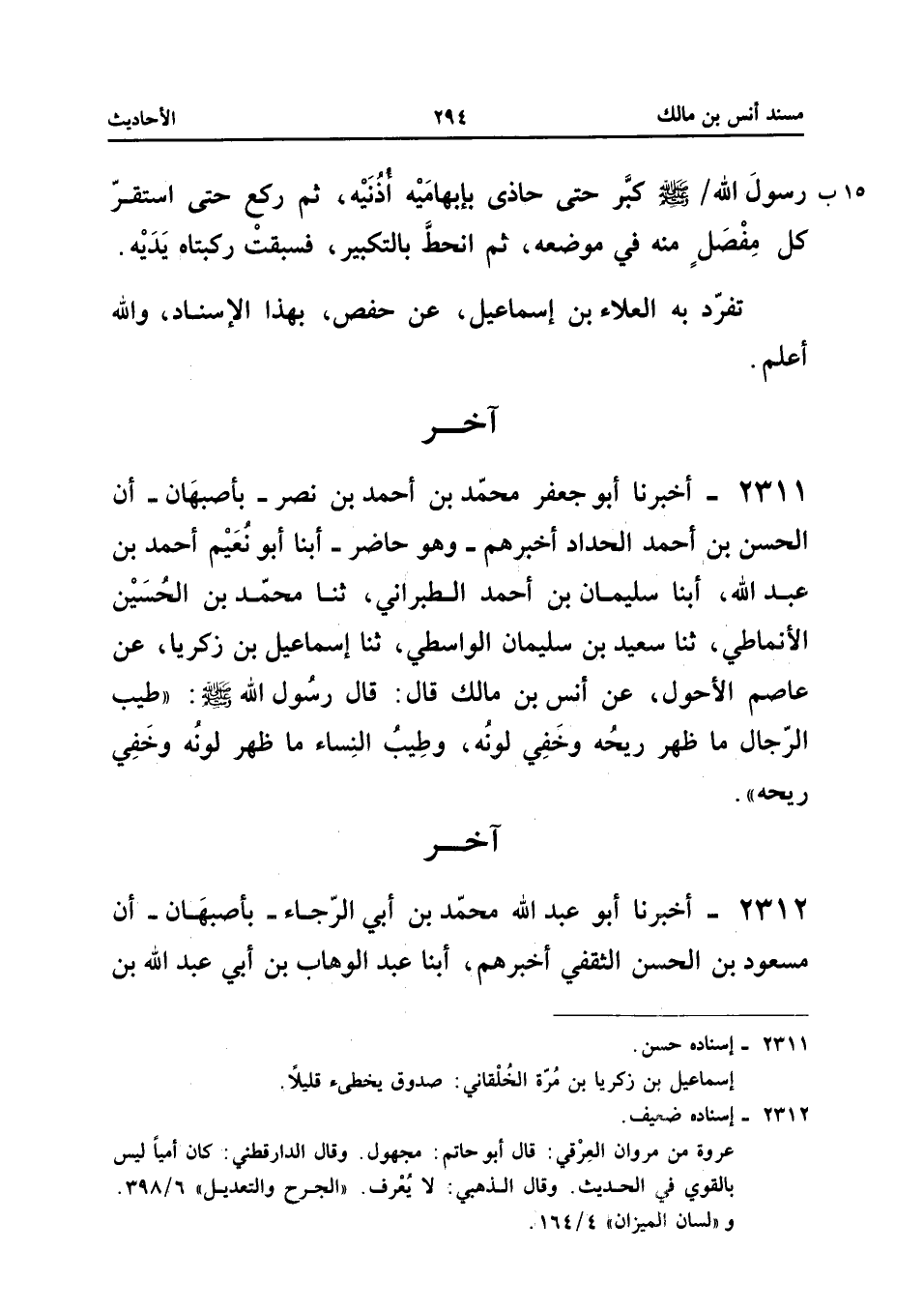 2311 - أَخْبَرَنَا أَبُو جَعْفَرٍ مُحَمَّدُ بْنُ أَحْمَدَ بْنِ نَصْرٍ بِأَصْبَهَانَ أَنَّ الْحَسَنَ بْنَ أَحْمَدَ الْحَدَّادَ أَخْبَرَهُمْ وَهُوَ حَاضِرٌ أبنا أَبُو نُعَيْمٍ أَحْمَدُ بْنُ عَبْدِ اللَّهِ أبنا سُلَيْمَانُ بْنُ أَحْمَدَ الطَّبَرَانِيُّ ثَنَا مُحَمَّدُ بْنُ الْحُسَيْنِ الأَنْمَاطِيُّ ثَنَا سَعِيدُ بْنُ سُلَيْمَانَ الْوَاسِطِيُّ ثَنَا إِسْمَاعِيلُ بْنُ زَكَرِيَّا عَنْ عَاصِمٍ الأَحْوَلِ عَنْ أَنَسِ بْنِ مَالِكٍ قَالَ قَالَ رَسُولُ اللَّهِ صَلَّى اللَّهُ عَلَيْهِ وَسَلَّمَ طِيبُ الرِّجَالِ مَا ظَهَرَ رِيحُهُ وَخَفِيَ لَوْنُهُ وَطِيبُ النِّسَاءِ مَا ظَهَرَ لَوْنُهُ وخفي رِيحه