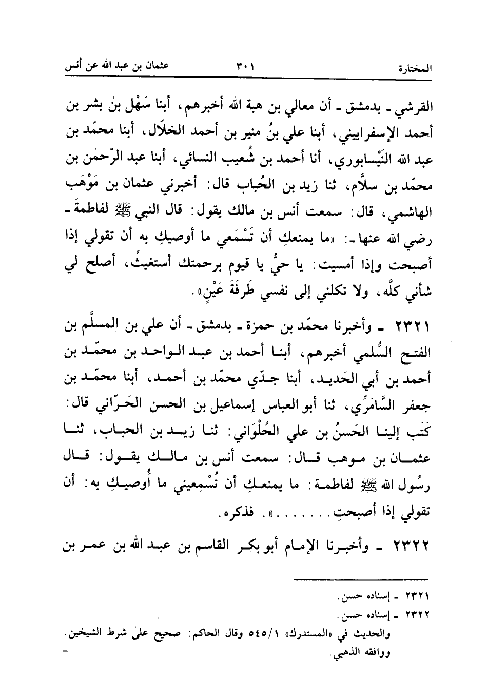 الْقُرَشِيُّ بِدِمَشْقَ أَنَّ مَعَالِي بْنَ هِبَةِ اللَّهِ أَخْبَرَهُمْ أبنا سَهْلُ بْنُ بِشْرِ بْنِ أَحْمَدَ الإِسْفَرَايِينِيُّ أبنا عَلِيُّ بْنُ مُنِيرِ بْنِ أَحْمَدَ الْخَلالُ أبنا مُحَمَّدُ بْنُ عَبْدِ اللَّهِ النَّيْسَابُورِيُّ أَنا أَحْمَدُ بْنُ شُعَيْبٍ النَّسَائِيُّ أبنا عَبْدُ الرَّحْمَنِ بْنُ مُحَمَّدِ بْنِ سَلامٍ ثَنَا زَيْدُ بْنُ الْحُبَابِ قَالَ أَخْبَرَنِي عُثْمَانُ بْنُ مَوْهَبٍ الْهَاشِمِيُّ قَالَ سَمِعْتُ أَنَسَ بْنَ مَالِكٍ يَقُولُ قَالَ النَّبِيُّ صَلَّى اللَّهُ عَلَيْهِ وَسَلَّمَ لِفَاطِمَةَ رَضِيَ اللَّهُ عَنْهَا مَا يَمْنَعُكِ أَنْ تَسْمَعِي مَا أُوصِيكِ بِهِ أَنْ تَقُولِي إِذَا أَصْبَحْتِ وَإِذَا أَمْسَيْتِ يَا حَيُّ يَا قَيُّومُ بِرَحْمَتِكَ أَسْتَغِيثُ أَصْلِحْ لِي شَأْنِي كُلَّهُ وَلا تَكِلْنِي إِلَى نَفسِي طرفَة عين إِسْنَاده حسن