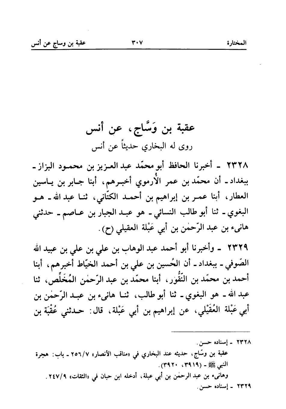 2329 - وَأَخْبَرَنَا أَبُو أَحْمَدَ عَبْدُ الْوَهَّابِ بْنُ عَلِيِّ بْنِ عَلِيِّ بْنِ عُبَيْدِ اللَّهِ الصُّوفِيُّ بِبَغْدَادَ أَنَّ الْحُسَيْنَ بْنَ عَلِيِّ بْنِ أَحْمَدَ الْخَيَّاطَ أَخْبَرَهُمْ أبنا أَحْمَدُ بْنُ مُحَمَّدِ بْنِ النَّقُّورِ أبنا مُحَمَّدُ بْنُ عَبْدِ الرَّحْمَنِ الْمُخَلِّصُ ثَنَا عَبْدُ اللَّهِ هُوَ الْبَغَوِيُّ ثَنَا أَبُو طَالِبٍ ثَنَا هَانِئُ بْنُ عَبْدِ الرَّحْمَنِ بْنِ أَبِي عَبْلَةَ الْعُقَيْلِيُّ عَنْ إِبْرَاهِيمَ بْنِ أَبِي عَبْلَةَ قَالَ حَدَّثَنِي عُقْبَةُ بْنُ وَسَّاجٍ عَنْ أَنَسِ بْنِ مَالِكٍ قَالَ قَالَ رَسُولُ اللَّهِ