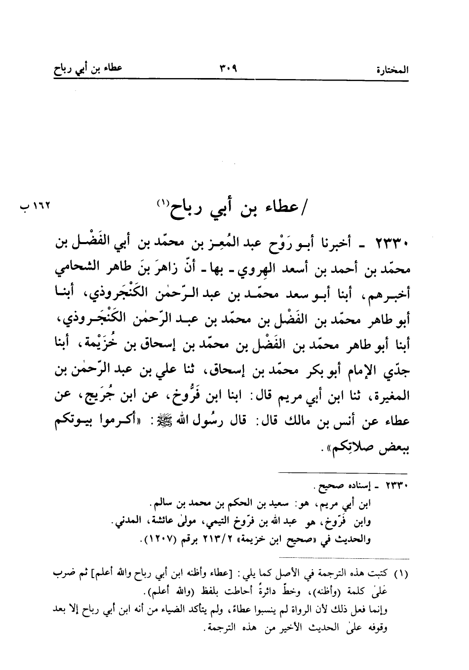 2330 - أَخْبَرَنَا أَبُو رَوْحٍ عَبْدُ الْمُعِزِّ بْنُ مُحَمَّدٍ بْنِ أَبِي الْفَضْلِ بْنِ مُحَمَّدِ بْنِ أَحْمَدَ بْنِ أَسْعَدَ الْهَرَوِيُّ بِهَا أَنَّ زَاهِرَ بْنَ طَاهِرٍ الشَّحَّامِيَّ أَخْبَرَهُمْ أبنا أَبُو سَعْدٍ مُحَمَّدُ بْنُ عَبْدِ الرَّحْمَنِ الْكَنْجَرُوذِيُّ أبنا أَبُو طَاهِرٍ مُحَمَّدُ بْنُ الْفَضْلِ بْنِ مُحَمَّدِ بْنِ عَبْدِ الرَّحْمَنِ الْكَنْجَرُوذِيُّ أبنا أَبُو طَاهِرٍ مُحَمَّدُ بْنُ الْفَضْلِ بْنِ مُحَمَّدِ بْنِ إِسْحَاقَ بْنِ خُزَيْمَةَ أبنا جَدِّي الإِمَامُ أَبُو بَكْرٍ مُحَمَّدُ بْنُ إِسْحَاقَ ثَنَا عَلِيُّ بْنُ عَبْدِ الرَّحْمَنِ بْنِ الْمُغِيرَةَ ثَنَا ابْنُ أَبِي مَرْيَمَ قَالَ أبنا ابْنُ فَرُّوخَ عَنِ ابْنِ جُرَيْجٍ عَنْ عَطَاءٍ عَنْ أَنَسِ بْنِ مَالِكٍ قَالَ قَالَ رَسُولُ اللَّهِ صَلَّى اللَّهُ عَلَيْهِ وَسَلَّمَ أَكْرِمُوا بُيُوتَكُمْ بِبَعْض صَلَاتكُمْ