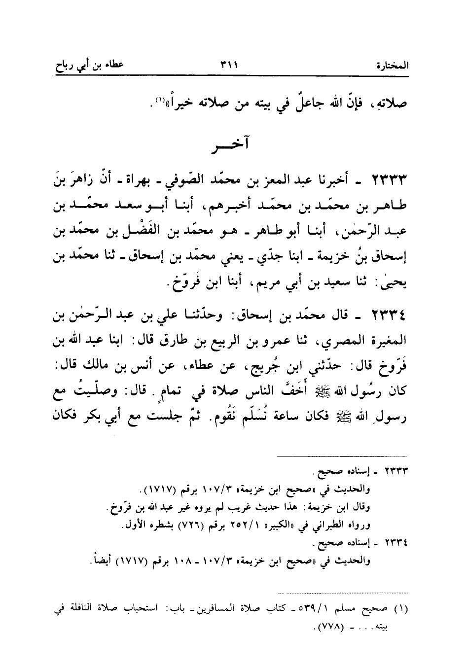 2333 - أَخْبَرَنَا عَبْدُ الْمُعِزِّ بْنُ مُحَمَّدٍ الصُّوفِيُّ بِهَرَاةَ أَنَّ زَاهِرَ بْنَ طَاهِرِ بْنِ مُحَمَّدِ بْنِ مُحَمَّدٍ أَخْبَرَهُمْ أبنا أَبُو سَعْدٍ مُحَمَّدُ بْنُ عَبْدِ الرَّحْمَنِ أبنا أَبُو طَاهِرٍ هُوَ مُحَمَّدُ بْنُ الْفَضْلِ بْنِ مُحَمَّدِ بْنِ إِسْحَاقَ بْنِ خُزَيْمَةَ أبنا جَدِّي يَعْنِي مُحَمَّدَ بْنَ إِسْحَاقَ ثَنَا مُحَمَّدُ بْنُ يَحْيَى ثَنَا سَعِيدُ بْنُ أبي مَرْيَم أبنا ابْن فروخ إِسْنَاده صَحِيح