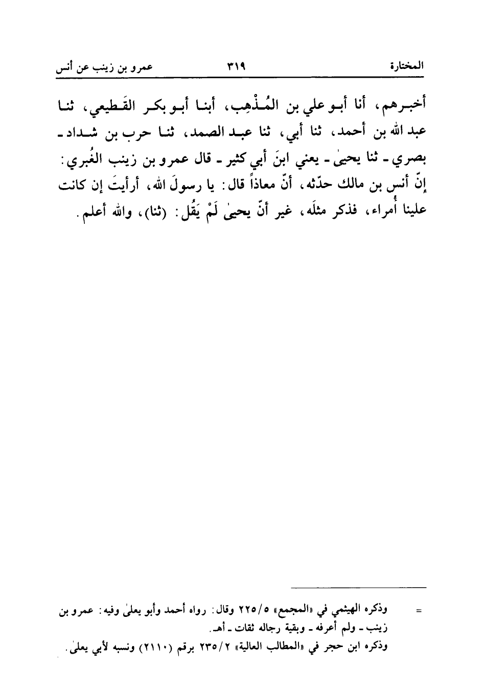 أَخْبَرَهُمْ أَنا أَبُو عَلِيِّ بْنُ الْمُذْهِبِ أبنا أَبُو بَكْرٍ الْقَطِيعِيُّ ثَنَا عَبْدُ اللَّهِ بْنُ أَحْمَدَ ثَنَا أَبِي ثَنَا عَبْدُ الصَّمَدِ ثَنَا حَرْبُ بْنُ شَدَّادٍ بَصْرِيٌّ ثَنَا يَحْيَى يَعْنِي ابْن أبي كثير قَالَ عَمْرو بن زَيْنَب الْغُبَرِيُّ إِنَّ أَنَسَ بْنَ مَالِكٍ حَدَّثَهُ أَنَّ مُعَاذًا قَالَ يَا رَسُولَ اللَّهِ أَرَأَيْتَ إِنْ كَانَتْ عَلَيْنَا أُمَرَاءُ