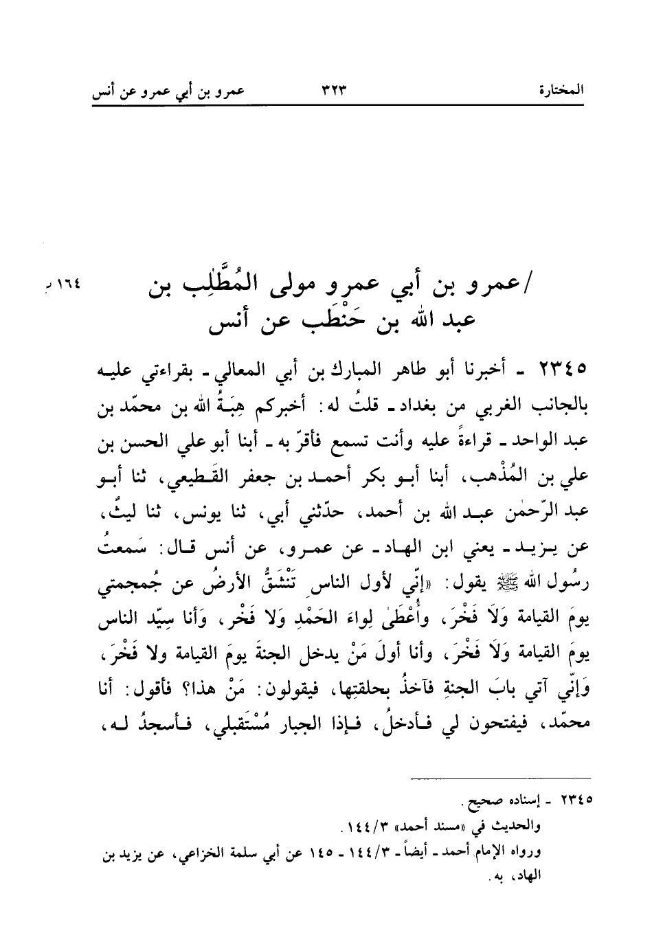 2345 - أَخْبَرَنَا أَبُو طَاهِرٍ الْمُبَارَكُ بْنُ أَبِي الْمَعَالِي بِقِرَاءَتِي عَلَيْهِ بِالْجَانِبِ الْغَرْبِيِّ مِنْ بَغْدَادَ قُلْتُ لَهُ أَخْبَرَكُمْ هِبَةُ اللَّهِ بْنُ مُحَمَّدِ بْنِ عَبْدِ الْوَاحِدِ قِرَاءَةً عَلَيْهِ وَأَنْتَ تَسْمَعُ فَأَقَرَّ بِهِ أبنا أَبُو عَلِيٍّ الْحَسَنُ بْنُ عَلِيِّ بْنِ الْمُذْهِبِ أبنا أَبُو بَكْرٍ أَحْمَدُ بْنُ جَعْفَرٍ الْقَطِيعِيُّ ثَنَا أَبُو عَبْدِ الرَّحْمَنِ عَبْدُ اللَّهِ بْنُ أَحْمَدَ حَدَّثَنِي أَبِي ثَنَا يُونُسُ ثَنَا لَيْثٌ عَنْ يَزِيدَ يَعْنِي ابْنَ الْهَادِ عَنْ عَمْرٍو عَنْ أَنَسٍ قَالَ سَمِعْتُ رَسُولَ اللَّهِ صَلَّى اللَّهُ عَلَيْهِ وَسَلَّمَ يَقُولُ إِنِّي لأَوَّلُ النَّاسِ تَنْشَقُّ الأَرْضُ عَنْ جُمْجُمَتِي يَوْمَ الْقِيَامَةِ وَلا فَخْرَ وَأُعْطَى لِوَاءَ الْحَمْدِ وَلا فَخْرَ وَأَنَا سَيِّدُ النَّاسِ يَوْمَ الْقِيَامَةِ وَلا فَخْرَ وَأَنَا أَوَّلُ مَنْ يَدْخُلُ الْجَنَّةَ يَوْمَ الْقِيَامَةِ وَلا فَخْرَ وَإِنِّي آتِي بَابَ الْجَنَّةِ فَآخُذُ بِحَلْقَتِهَا فَيَقُولُونَ مَنْ هَذَا فَأَقُولُ أَنَا مُحَمَّدٌ فَيَفْتَحُونَ لِي فَأَدْخُلُ فَإِذَا الْجَبَّارُ مُسْتَقْبِلِي فأسجد لَهُ