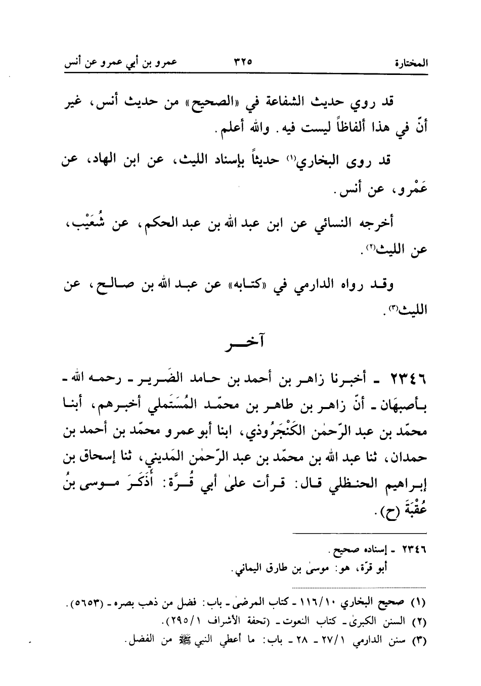 2346 - أَخْبَرَنَا زَاهِرُ بْنُ أَحْمَدَ بْنِ حَامِدٍ الضَّرِيرُ رَحِمَهُ اللَّهُ بِأَصْبَهَانَ أَنَّ زَاهِرَ بْنَ طَاهِرِ بْنِ مُحَمَّدٍ الْمُسْتَمْلِي أَخْبَرَهُمْ أبنا مُحَمَّدُ بْنُ عَبْدِ الرَّحْمَنِ الْكَنْجَرُوذِيُّ أبنا أَبُو عَمْرٍو مُحَمَّدُ بْنُ أَحْمَدَ بْنِ حَمْدَانَ ثَنَا عَبْدُ اللَّهِ بْنُ مُحَمَّدِ بْنِ عَبْدِ الرَّحْمَنِ الْمَدِينِيُّ ثَنَا إِسْحَاقُ بْنُ إِبْرَاهِيمَ الْحَنْظَلِيُّ قَالَ قَرَأْتُ عَلَى أَبِي قُرَّةَ أَذَكَرَ مُوسَى بْنُ عُقْبَةَ (ح) إِسْنَاده صَحِيح