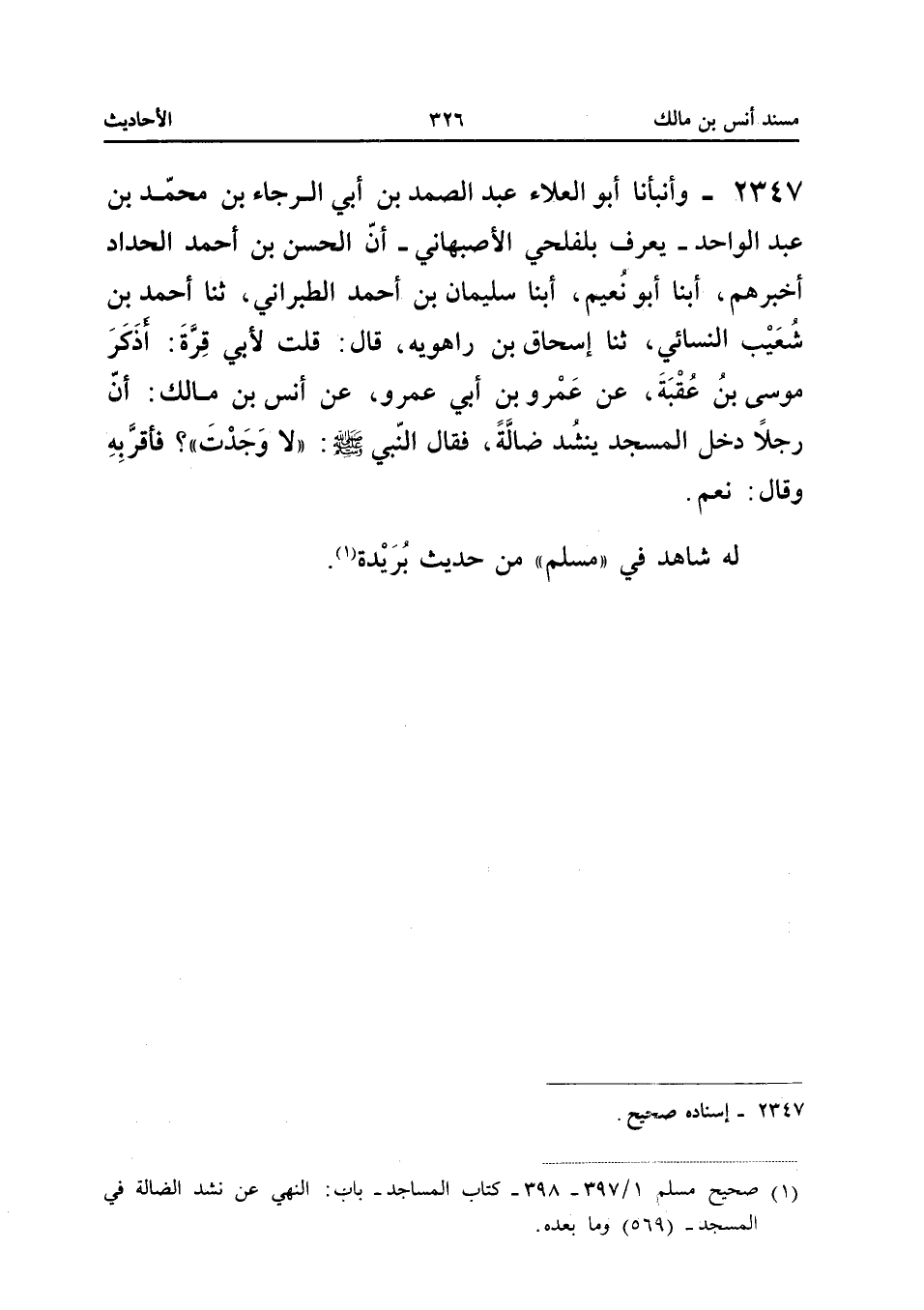 2347 - وَأَنْبَأَنَا أَبُو الْعَلاءِ عَبْدُ الصَّمَدِ بْنُ أَبِي الرَّجَاءِ بْن مُحَمَّدِ بْنِ عَبْدِ الْوَاحِدِ يُعْرَفُ بلفلحي الأَصْبَهَانِيِّ أَنَّ الْحَسَنَ بْنَ أَحْمَدَ الْحَدَّادَ أَخْبَرَهُمْ أبنا أَبُو نُعَيْمٍ أبنا سُلَيْمَانُ بْنُ أَحْمَدَ الطَّبَرَانِيُّ ثَنَا أَحْمَدُ بْنُ شُعَيْبٍ النَّسَائِيُّ ثَنَا إِسْحَاقُ بْنُ رَاهُوَيْهِ قَالَ قُلْتُ لأَبِي قُرَّةَ أَذَكَرَ مُوسَى بْنُ عُقْبَةَ عَنْ عَمْرِو بْنِ أَبِي عَمْرٍو عَنْ أَنَسِ بْنِ مَالِكٍ أَنَّ رَجُلا دَخَلَ الْمَسْجِدَ يَنْشُدُ ضَالَّةً فَقَالَ النَّبِيُّ صَلَّى اللَّهُ عَلَيْهِ وَسَلَّمَ لَا وَجَدْتَ فَأَقَرَّ بِهِ وَقَالَ نَعَمْ