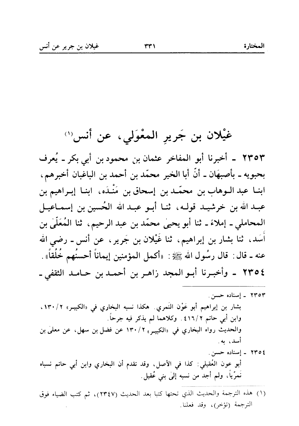 2353 - أَخْبَرَنَا أَبُو الْمُفَاخِرِ عُثْمَانُ بْنُ مَحْمُودِ بْنِ أَبِي بَكْرٍ يُعْرَفُ بِحَبُّوَيْهِ بِأَصْبَهَانَ أَنَّ أَبَا الْخَيْرِ مُحَمَّدَ بْنَ أَحْمَدَ بْنِ الْبَاغْبَانِ أَخْبَرَهُمْ أبنا عَبْدُ الْوَهَّابِ بْنُ مُحَمَّدِ بْنِ إِسْحَاقَ بْنِ مَنْدَهْ أبنا إِبْرَاهِيمُ بْنُ عَبْدِ اللَّهِ بْنِ خُرْشِيدَ قُولَةَ ثَنَا أَبُو عَبْدِ اللَّهِ الْحُسَيْنَ بْنِ إِسْمَاعِيلَ الْمَحَامِلِيُّ إِمْلاءً ثَنَا أَبُو يَحْيَى مُحَمَّدُ بْنُ عَبْدِ الرَّحِيمِ ثَنَا الْمُعَلَّى بْنُ أَسَدٍ ثَنَا بَشَّارُ بْنُ إِبْرَاهِيمَ ثَنَا غيلَان بن جرير عَن أنس رَضِي عَنْهُ قَالَ قَالَ رَسُولُ اللَّهِ صَلَّى اللَّهُ عَلَيْهِ وَسَلَّمَ أَكْمَلُ الْمُؤْمِنِينَ إِيمَانًا أَحْسَنُهُمْ خُلُقًا إِسْنَاده حسن