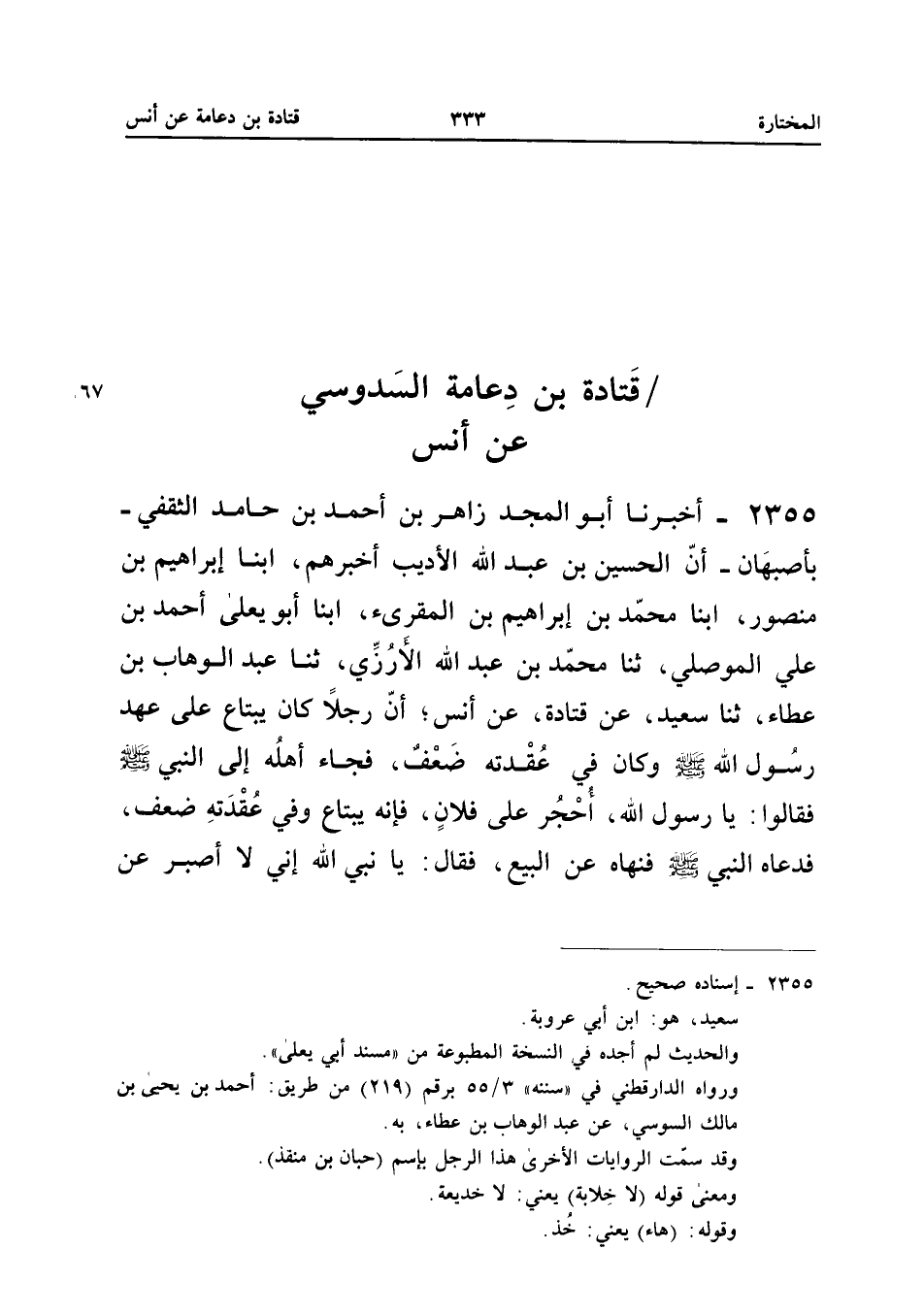 2355 - أَخْبَرَنَا أَبُو الْمَجْدِ زَاهِرُ بْنُ أَحْمَدَ بْنِ حَامِدٍ الثَّقَفِيُّ بِأَصْبَهَانَ أَنَّ الْحُسَيْنَ بْنَ عَبْدِ اللَّهِ الأَدِيبَ أَخْبَرَهُمْ أبنا إِبْرَاهِيمُ بْنُ مَنْصُورٍ أبنا مُحَمَّدُ بْنُ إِبْرَاهِيمَ بْنِ الْمُقْرِئِ أبنا أَبُو يَعْلَى أَحْمَدُ بْنُ عَلِيٍّ الْمَوْصِلِيُّ ثَنَا مُحَمَّدُ بْنُ عَبْدِ اللَّهِ الأَرُزِّيُّ ثَنَا عَبْدُ الْوَهَّابِ بْنُ عَطَاءٍ ثَنَا سَعِيدٌ عَنْ قَتَادَةَ عَنْ أَنَسٍ أَنَّ رَجُلا كَانَ يَبْتَاعُ عَلَى عَهْدِ رَسُولِ اللَّهِ صَلَّى اللَّهُ عَلَيْهِ وَسَلَّمَ وَكَانَ فِي عُقْدَتِهِ ضَعْفٌ فَجَاءَ أَهْلُهُ إِلَى النَّبِيَّ صَلَّى اللَّهُ عَلَيْهِ وَسَلَّمَ فَقَالُوا يَا رَسُولَ اللَّهِ احْجُرْ عَلَى فُلانٍ فَإِنَّهُ يَبْتَاعُ وَفِي عُقْدَتِهِ ضَعْفٌ فَدَعَاهُ النَّبِيُّ صَلَّى اللَّهُ عَلَيْهِ وَسَلَّمَ فَنَهَاهُ عَنِ الْبَيْعِ فَقَالَ يَا نَبِيَّ اللَّهِ إِنِّي لَا أَصْبِرُ عَنِ