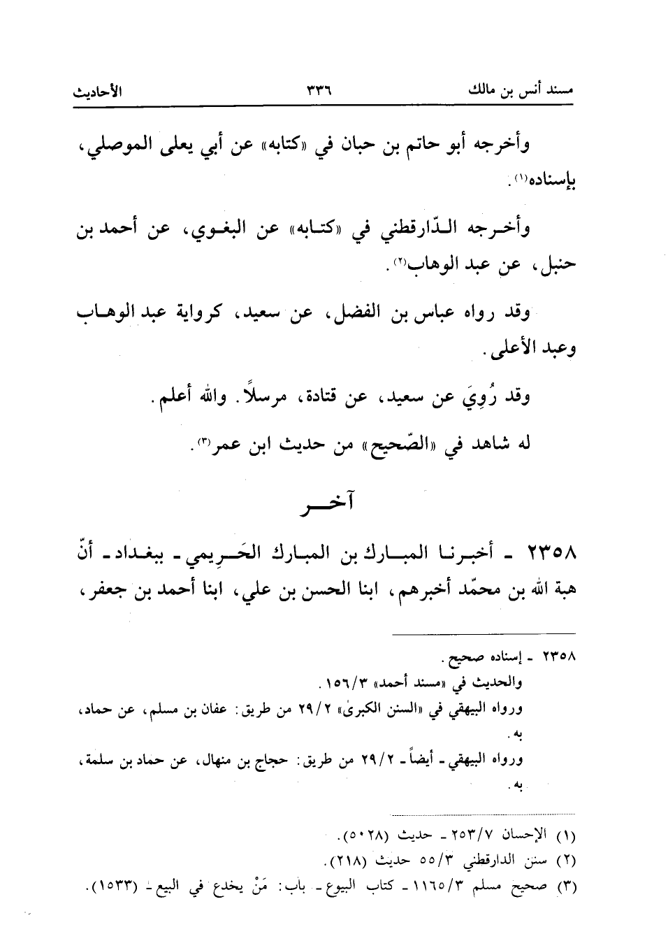 وَأَخْرَجَهُ أَبُو حَاتِمِ بْنُ حِبَّانَ فِي كِتَابِهِ عَنْ أَبِي يَعْلَى الْمَوْصِلِيِّ بِإِسْنَادِهِ وَأَخْرَجَهُ الدَّارَقُطْنِيُّ فِي كِتَابِهِ عَنِ الْبَغَوِيِّ عَنْ أَحْمَدَ بْنِ حَنْبَلٍ عَنْ عَبْدِ الْوَهَّابِ وَقَدْ رَوَاهُ عَبَّاسُ بْنُ الْفَضْلِ عَنْ سَعِيدٍ كَرِوَايَةِ عَبْدِ الْوَهَّابِ وَعَبْدِ الأَعْلَى وَقَدْ رُوِيَ عَنْ سَعِيدٍ عَنْ قَتَادَة مُرْسلا الله أَعْلَمُ لَهُ شَاهِدٌ فِي الصَّحِيحِ مِنْ حَدِيثِ ابْن عمر