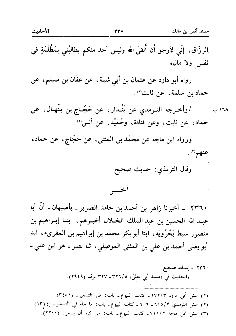 رَوَاهُ أَبُو دَاوُدَ عَنْ عُثْمَانَ بْنِ أَبِي شَيْبَةَ عَنْ عَفَّانَ بْنِ مُسْلِمٍ عَنْ حَمَّادَ بْنِ سَلَمَةَ عَنْ ثَابِتٍ وَأَخْرَجَهُ التِّرْمِذِيُّ عَنْ بُنْدَارٍ عَنْ حَجَّاجِ بْنِ مِنْهَالٍ عَنْ حَمَّادٍ عَنْ ثَابِتٍ وَعَنْ قَتَادَةَ وَحُمَيْدٍ عَنْ أَنَسٍ وَرَوَاهُ ابْنُ مَاجَهْ عَنْ مُحَمَّدِ بْنِ الْمُثَنَّى عَنْ حَجَّاجٍ عَنْ حَمَّادٍ عَنْهُمْ وَقَالَ التِّرْمِذِيّ حَدِيث صَحِيح