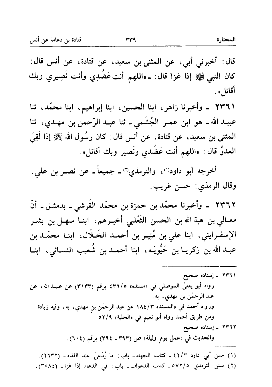 2361 - وَأَخْبَرَنَا زَاهِرٌ أبنا الْحُسَيْنُ أبنا إِبْرَاهِيمَ أبنا مُحَمَّدٌ ثَنَا عُبَيْدُ اللَّهِ هُوَ ابْنُ عُمَرَ الْجُشَمِيُّ ثَنَا عَبْدُ الرَّحْمَنِ بْنُ مَهْدِيٍّ ثَنَا الْمُثَنَّى بْنِ سَعِيدٍ عَنْ قَتَادَةَ عَنْ أَنَسٍ قَالَ كَانَ رَسُولُ اللَّهِ صَلَّى اللَّهُ عَلَيْهِ وَسَلَّمَ إِذَا لَقِيَ الْعَدُوَّ قَالَ اللَّهُمَّ أَنْتَ عَضُدِي وَنَصِيرِي وَبِكَ أُقَاتِلُ