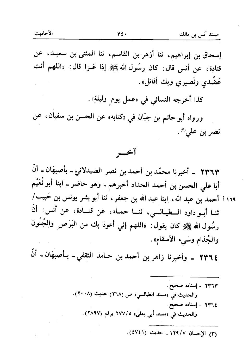 2363 - أَخْبَرَنَا مُحَمَّدُ بْنُ أَحْمَدَ بْنِ نَصْرٍ الصَّيْدَلانِيُّ بِأَصْبَهَانَ أَنَّ أَبَا عَلِيٍّ الْحَسَنَ بْنَ أَحْمَدَ الْحَدَّادَ أَخْبَرَهُمْ وَهُوَ حَاضِرٌ أبنا أَبُو نُعَيْمٍ أَحْمَدُ بْنُ عَبْدِ اللَّهِ أبنا عَبْدُ اللَّهِ بْنُ جَعْفَرٍ ثَنَا أَبُو بِشْرٍ يُونُسُ بْنُ حَبِيبٍ ثَنَا أَبُو دَاوُدَ الطَّيَالِسِيُّ ثَنَا حَمَّادٌ عَنْ قَتَادَةَ عَنْ أَنَسٍ أَنَّ رَسُولَ اللَّهِ صَلَّى اللَّه عَلَيْهِ وَسَلَّمَ كَانَ يَقُولُ اللَّهُمَّ إِنِّي أَعُوذُ بِكَ مِنَ الْبَرَصِ وَالْجُنُونِ وَالْجُذَامِ وسيء الأسقام إِسْنَاده صَحِيح