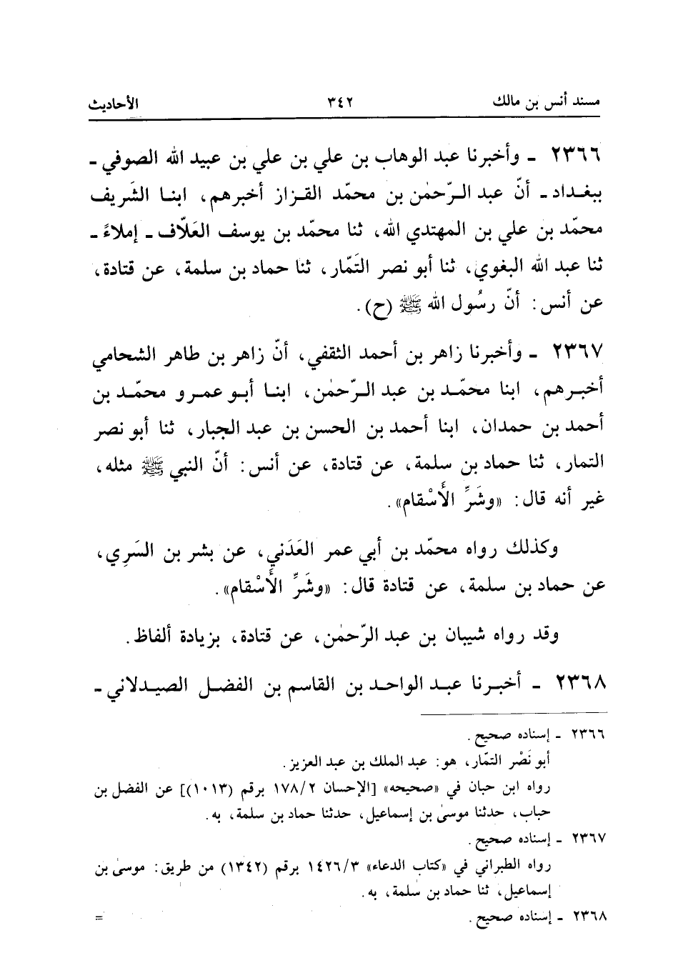 2366 - وأَخْبَرَنَا عَبْدُ الْوَهَّابِ بْنُ عَلِيِّ بْنِ عَلِيٍّ بْنِ عُبَيْدِ اللَّهِ الصُّوفِيُّ بِبَغْدَادَ أَنَّ عَبْدَ الرَّحْمَنِ بْنَ مُحَمَّدٍ الْقَزَّازَ أَخْبَرَهُمْ أبنا الشَّرِيفُ مُحَمَّد بن عَليّ بن الْمُهْتَدي الله ثَنَا مُحَمَّدُ بْنُ يُوسُفَ الْعَلافُ إِمْلاءً ثَنَا عَبْدُ اللَّهِ الْبَغَوِيُّ ثَنَا أَبُو نَصْرٍ التَّمَّارُ ثَنَا حَمَّادُ بْنُ سَلَمَةَ عَنْ قَتَادَةَ عَنْ أَنَسٍ أَنَّ رَسُولَ اللَّهِ صَلَّى اللَّهُ عَلَيْهِ وَسلم (ح) إِسْنَاده صَحِيح