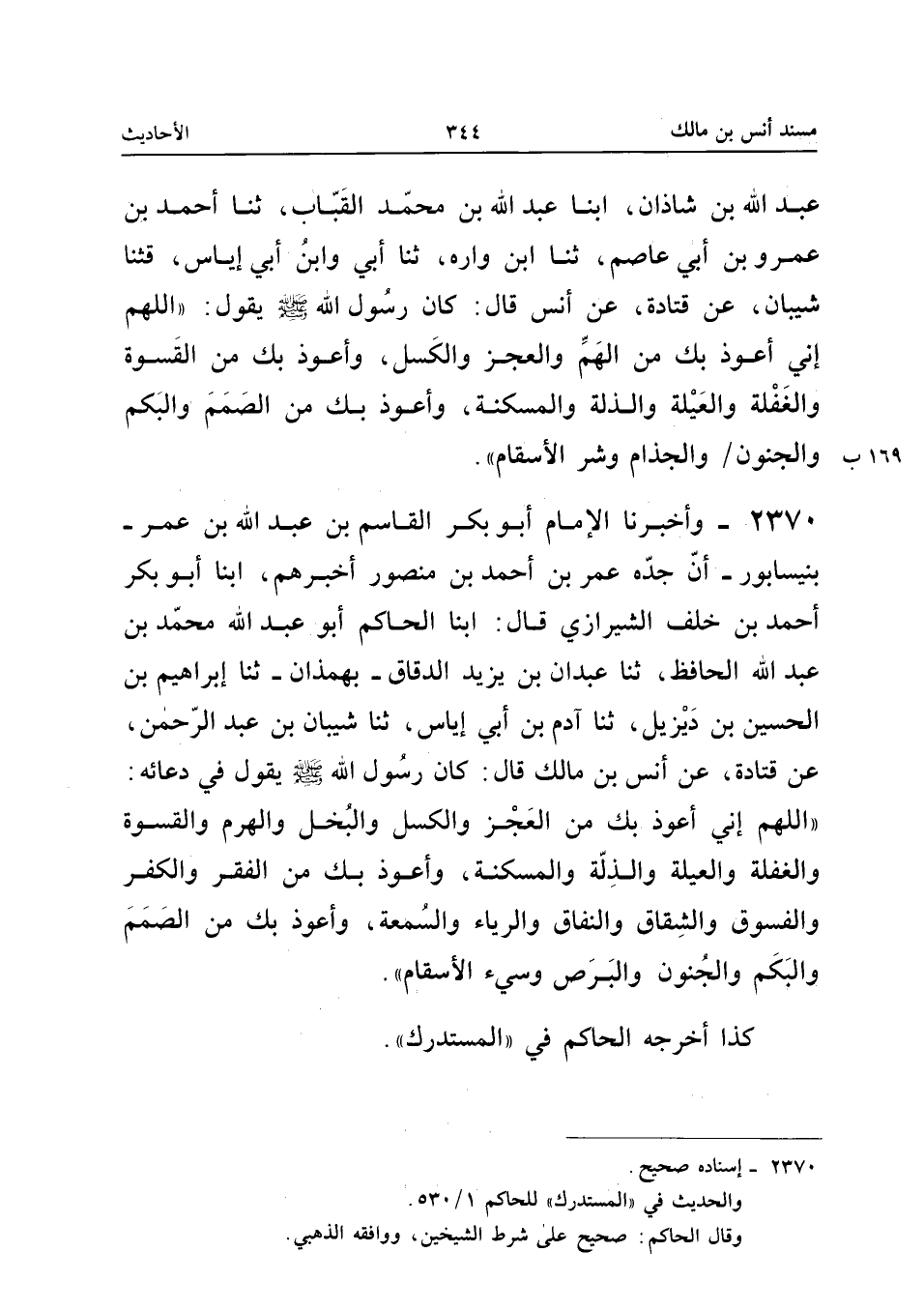 2370 - وَأَخْبَرَنَا الإِمَامُ أَبُو بَكْرٍ الْقَاسِمُ بْنُ عَبْدِ اللَّهِ بْنِ عُمَرَ بِنَيْسَابُورَ أَنَّ جَدَّهُ عُمَرَ بْنَ أَحْمَدَ بْنِ مَنْصُورٍ أَخْبَرَهُمْ أبنا أَبُو بَكْرٍ أَحْمَدُ بْنُ خَلَفٍ الشِّيرَازِيُّ قَالَ أبنا الْحَاكِمُ أَبُو عَبْدِ اللَّهِ مُحَمَّدُ بْنُ عَبْدِ اللَّهِ الْحَافِظُ ثَنَا عَبْدَانُ بْنُ يَزِيدَ الدَّقَّاقُ بِهَمَذَانَ ثَنَا إِبْرَاهِيمُ بْنُ الْحُسَيْنِ بْنِ دَيْزِيلَ ثَنَا آدَمُ بْنُ أَبِي إِيَاسٍ ثَنَا شَيْبَانُ بْنُ عَبْدِ الرَّحْمَنِ عَنْ قَتَادَةَ عَنْ أَنَسِ بْنِ مَالِكٍ قَالَ كَانَ رَسُولُ اللَّهِ صَلَّى اللَّهُ عَلَيْهِ وَسَلَّمَ يَقُولُ فِي دُعَائِهِ اللَّهُمَّ إِنِّي أَعُوذُ بِكَ مِنَ الْعَجْزِ وَالْكَسَلِ وَالْبُخْلِ وَالْهَرَمِ وَالْقَسْوَةِ وَالْغَفْلَةِ وَالْعَيْلَةِ وَالذِّلَّةِ وَالْمَسْكَنَةِ وَأَعُوذُ بِكَ مِنَ الْفَقْرِ وَالْكُفْرِ وَالْفُسُوقِ وَالشِّقَاقِ وَالنِّفَاقِ وَالرِّيَاءِ وَالسُّمْعَةِ وَأَعُوذُ بِكَ مِنَ الصَّمَمَ وَالْبَكَمِ وَالْجُنُون والبرص وسيء الأسقام
