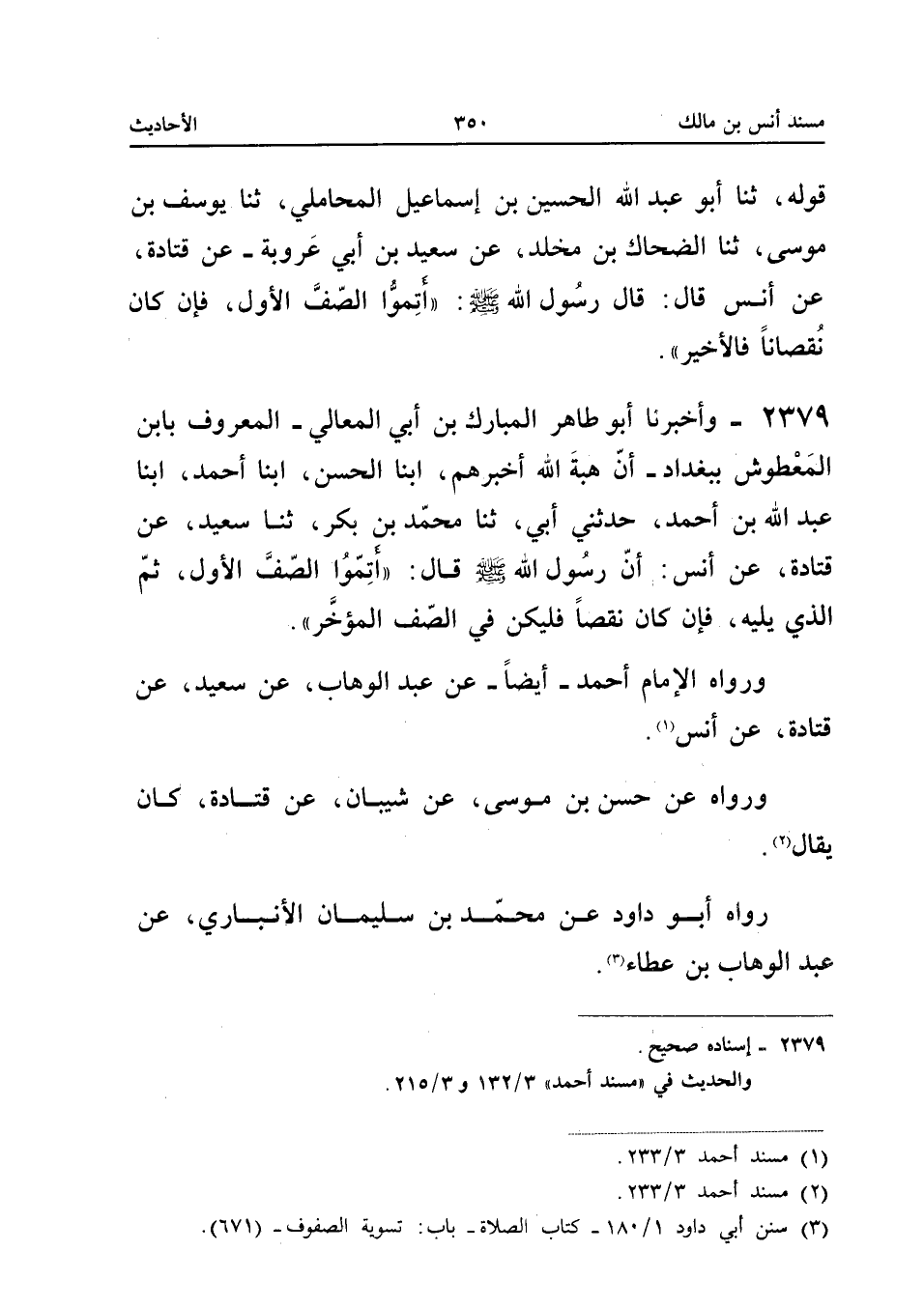 2379 - وَأَخْبَرَنَا أَبُو طَاهِرٍ الْمُبَارَكُ بْنُ أَبِي الْمَعَالِي الْمَعْرُوفُ بِابْنِ الْمَعْطُوشِ بِبَغْدَادَ أَنَّ هِبَةَ اللَّهِ أَخْبَرَهُمْ أبنا الْحَسَنُ أبنا أَحْمَدُ أبنا عَبْدُ اللَّهِ بْنُ أَحْمَدَ حَدَّثَنِي أَبِي ثَنَا مُحَمَّدُ بْنُ بَكْرٍ ثَنَا سَعِيدٌ عَنْ قَتَادَةَ عَنْ أَنَسٍ أَنَّ رَسُولَ اللَّهِ صَلَّى اللَّهُ عَلَيْهِ وَسَلَّمَ قَالَ أَتِمُّوا الصَّفَّ الأَوَّلَ ثُمَّ الَّذِي يَلِيهِ فَإِنْ كَانَ نَقْصًا فَلْيَكُنْ فِي الصَّفِّ الْمُؤَخَّرِ