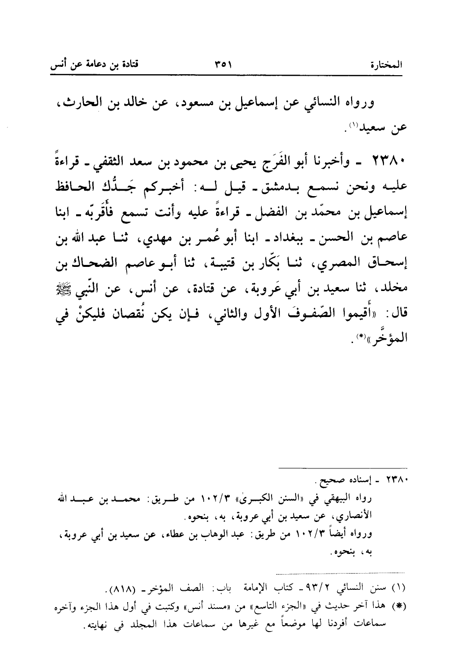2380 - وَأَخْبَرَنَا أَبُو الْفَرَجِ يَحْيَى بْنُ مَحْمُودِ بْنِ سَعْدٍ الثَّقَفِيُّ قِرَاءَةً عَلَيْهِ وَنَحْنُ نَسْمَعُ بِدِمَشْقَ قِيلَ لَهُ أَخْبَرَكُمْ جَدُّكَ الْحَافِظُ إِسَمْاعِيلُ بْنُ مُحَمَّدِ بْنِ الْفَضْلِ قِرَاءَةً عَلَيْهِ وَأَنْتَ تَسْمَعُ فَأَقَرَّ بِهِ أبنا عَاصِمُ بْنُ الْحَسَنِ بِبَغْدَادَ أبنا أَبُو عُمَرَ بْنُ مَهْدِيٍّ ثَنَا عَبْدُ اللَّهِ بْنُ إِسْحَاقَ الْمِصْرِيُّ ثَنَا بَكَّارُ بْنُ قُتَيْبَةَ ثَنَا أَبُو عَاصِمٍ الضَّحَّاكُ بْنُ مَخْلَدٍ ثَنَا سَعِيدُ بْنُ أَبِي عَرُوبَةَ عَنْ قَتَادَةَ عَنْ أَنَسٍ عَنِ النَّبِيِّ صَلَّى اللَّهُ عَلَيْهِ وَسَلَّمَ قَالَ أَقِيمُوا الصُّفُوفَ الأَوَّلَ وَالثَّانِي فَإِنْ يكن نُقْصَان فَلْيَكُن فِي الْمُؤخر